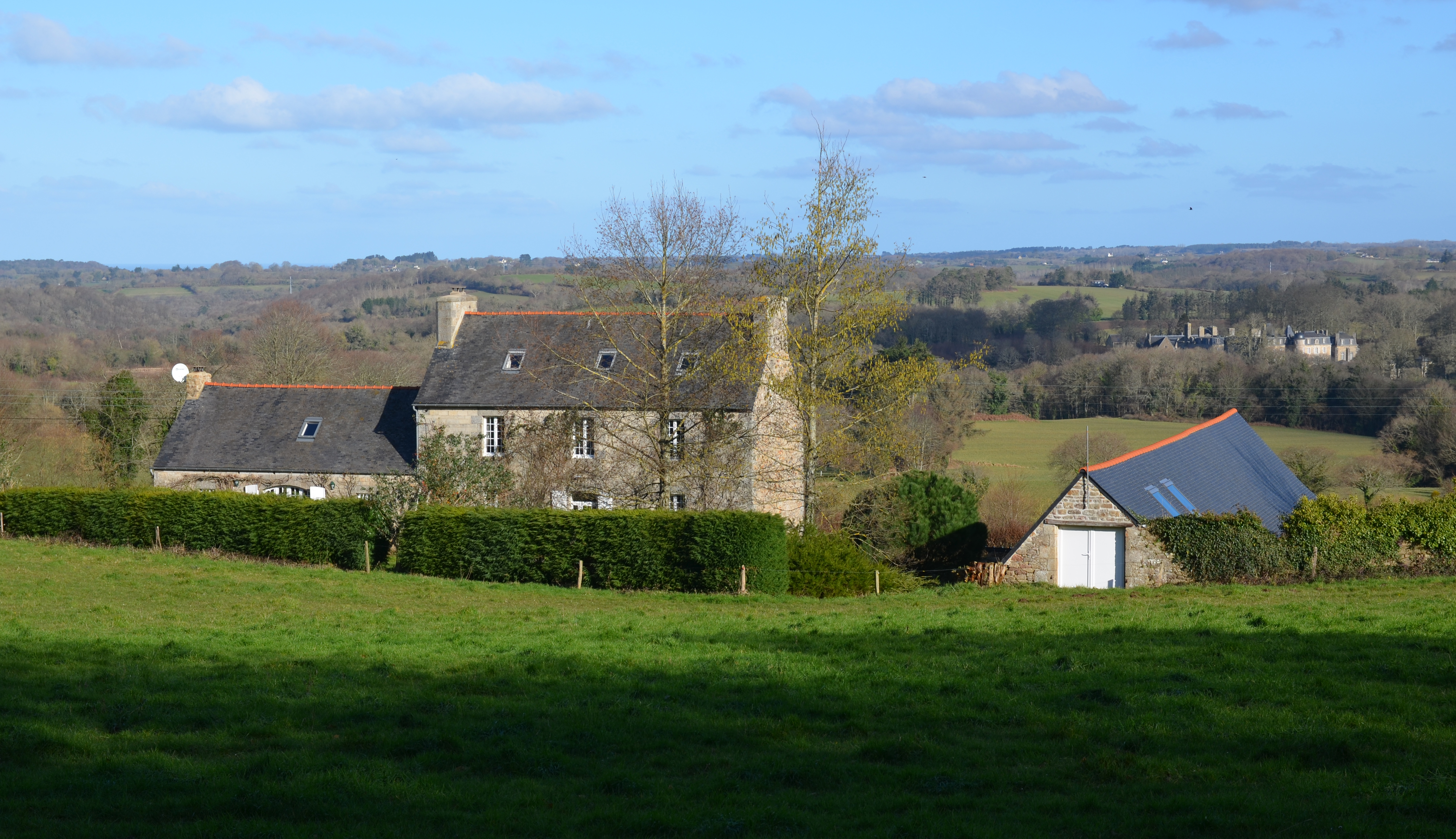 Plufur, Ar Run : ferme, vue générale (une ferme existait déja à cet emplacement en 1816). Le logis est daté par millésime de 1870. En arrière-plan à droite : le château de RosanboImmatriculation