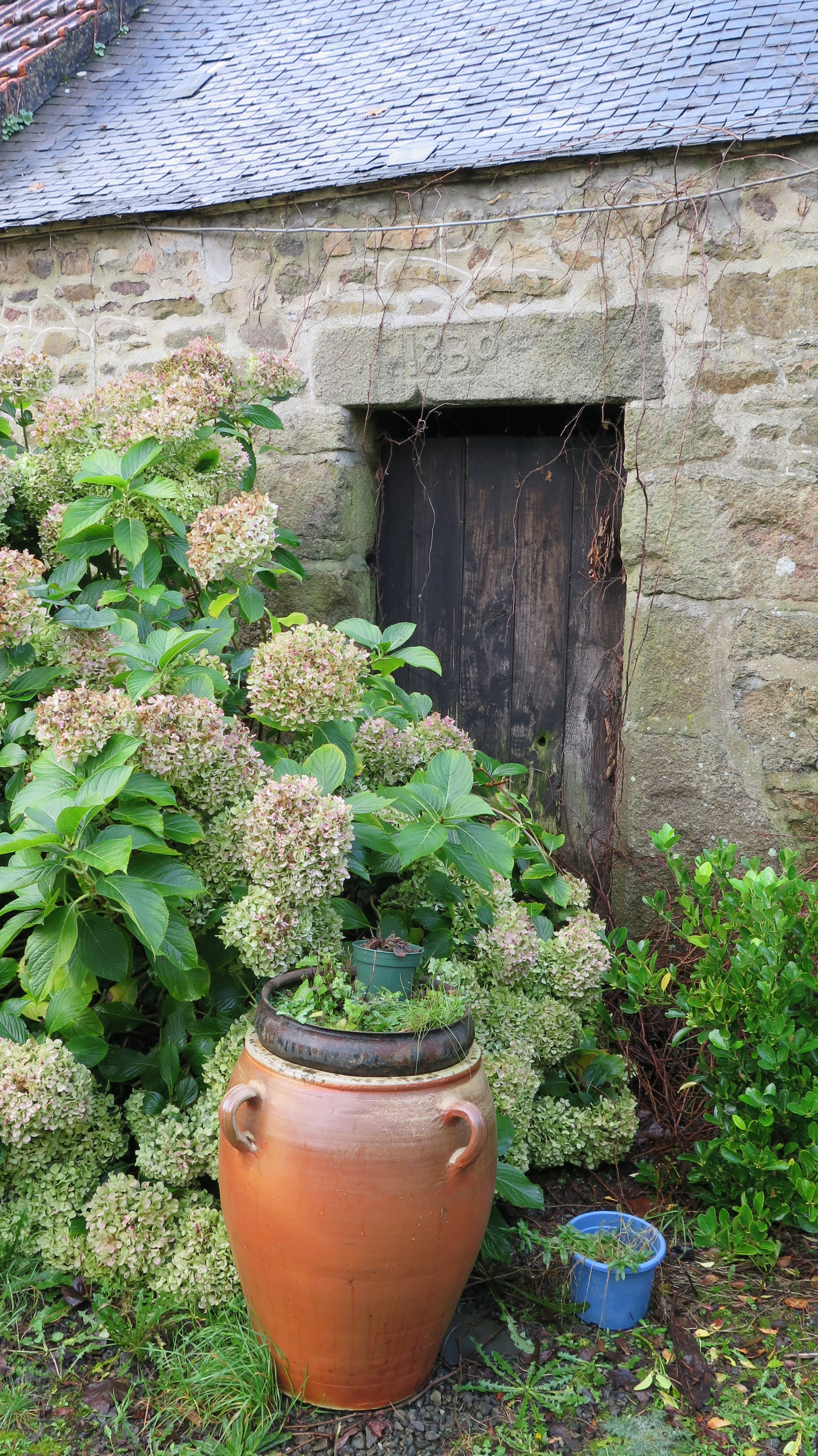 Plufur, Fifac'h : dépendance. Un linteau ancien à accolade (16e siècle) a été réutilisé en 1830. Au premier plan : saloir du 19e siècle en grès émailléImmatriculation