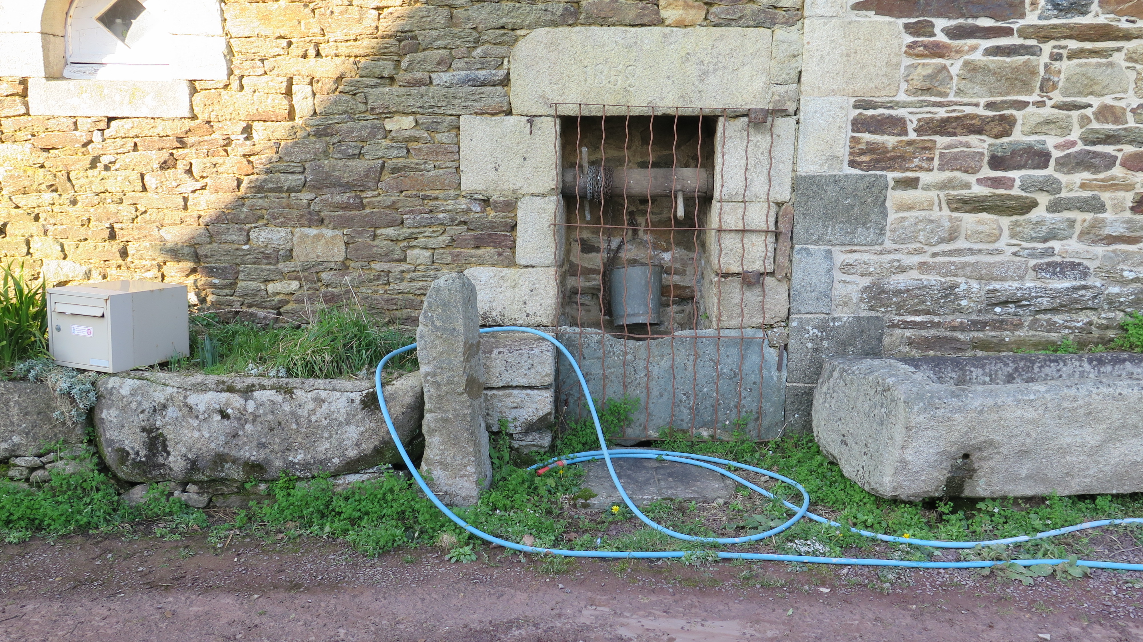 Plufur, Guerneven : puits intégré dans la façade. Il est daté par millésime de 1858Immatriculation