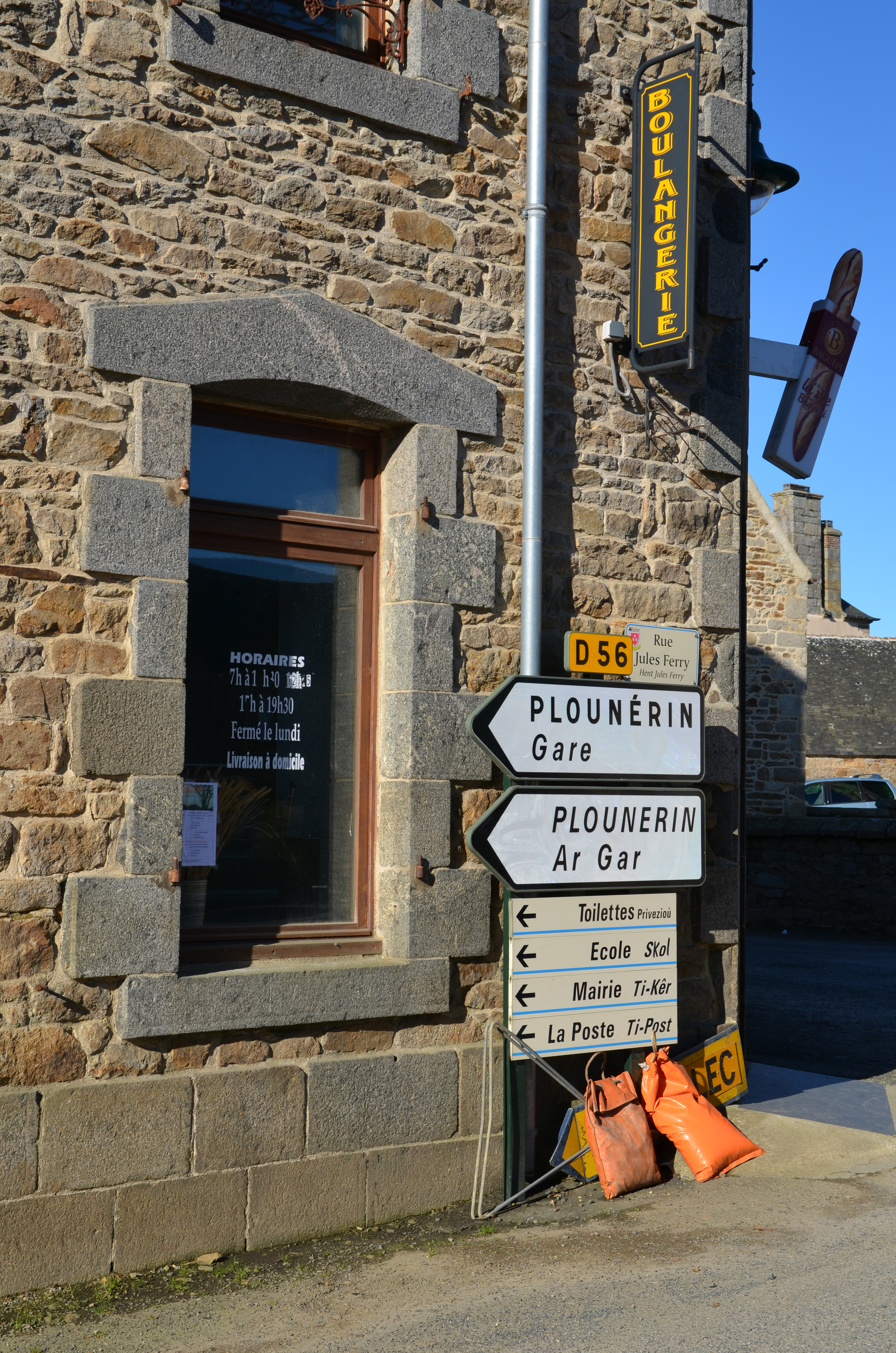 Plufur, croisement des rues Jules Ferry et Joliot-Curie : magasin de commerce (boulangerie), panneaux indicateursImmatriculation