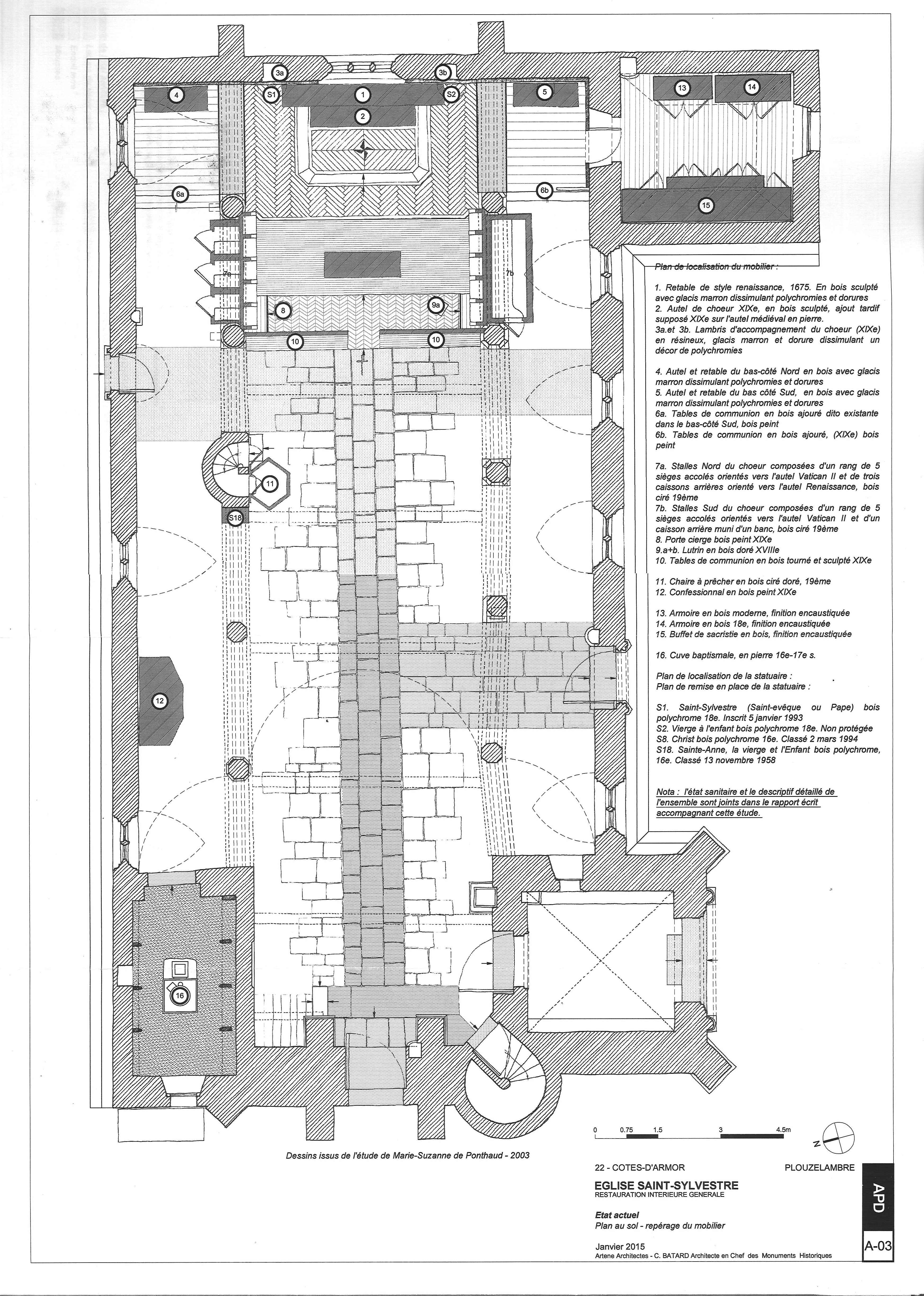 Plouzélambre, le bourg, enclos paroissial : plan au sol de l'église Saint-Sylvestre, repérage du mobilier (extrait de l'étude préalable à la restauration de l'église par Artene Architectes, Christophe BATARD, architecte en chef des monuments historiques, janvier 2015)Immatriculation