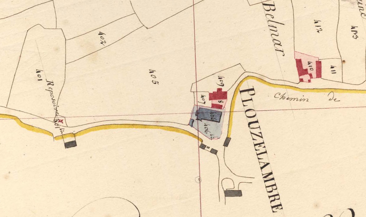 Extrait du cadastre ancien de la commune de Plouzélambre, 1814 : l'ossuaire à l'ouest du bourgImmatriculation