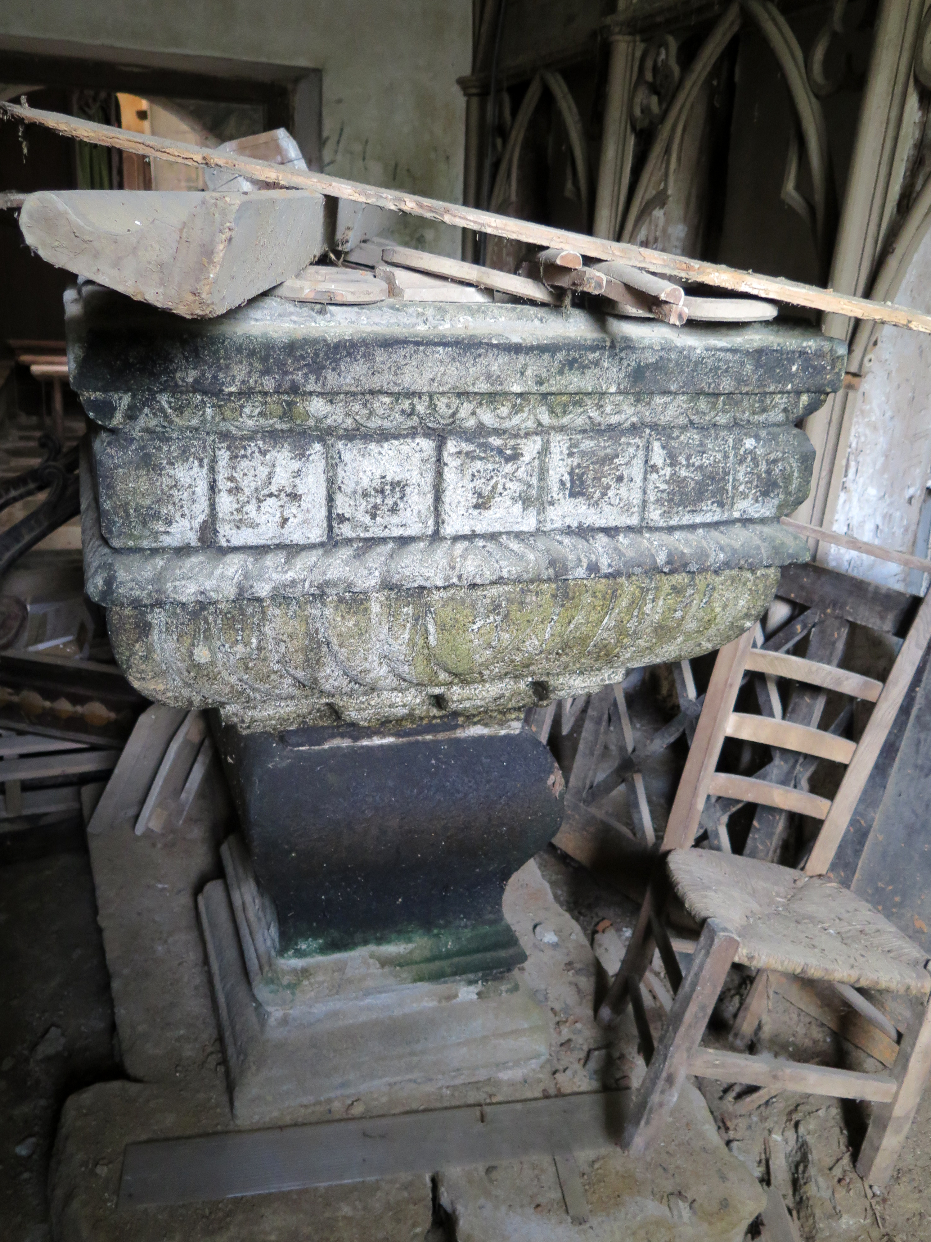 Plouzélambre, le bourg, enclos paroissial : église Saint-Sylvestre, chapelle des fonts baptismaux, cuve baptismale en granite Renaissance (fin 16e siècle)Immatriculation