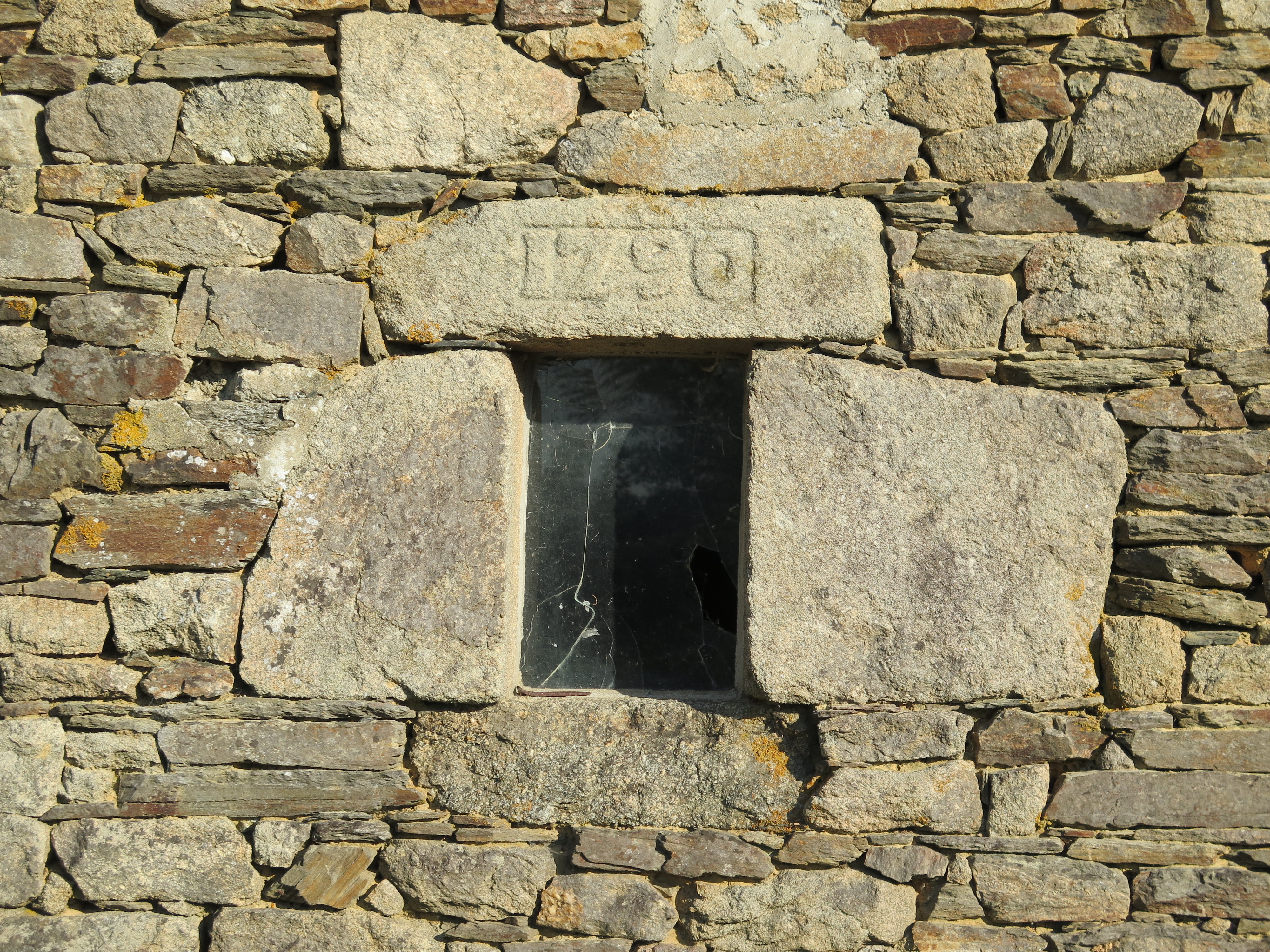 Plouzélambre, Toull ar Groaz : logis, élévation sud, détail de la fenêtre portant le millésime "1790"Immatriculation