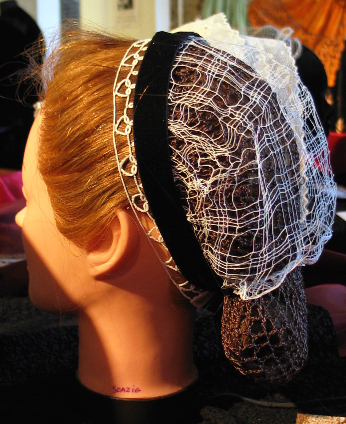 Coiffe de Gouarec exposée à Gourin en Juillet 2010. Le serre-tête en velours noire ne se justifirait pas d'après Vincent Roussel qui a transmis cette photo.Immatriculation