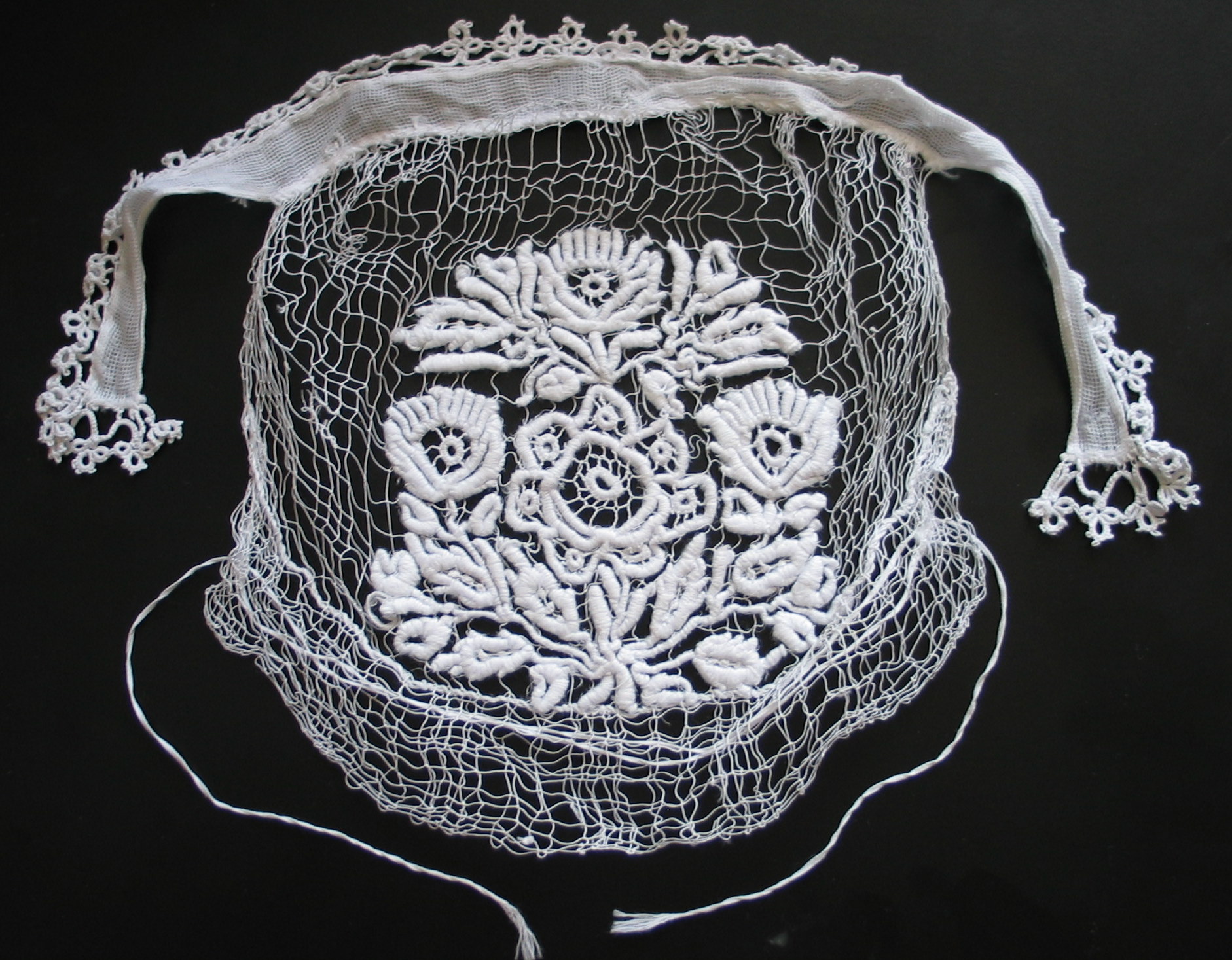Coiffe Fanch brodé plumetis en filet irrégulier. Collection de Vincent Roussel.Immatriculation
