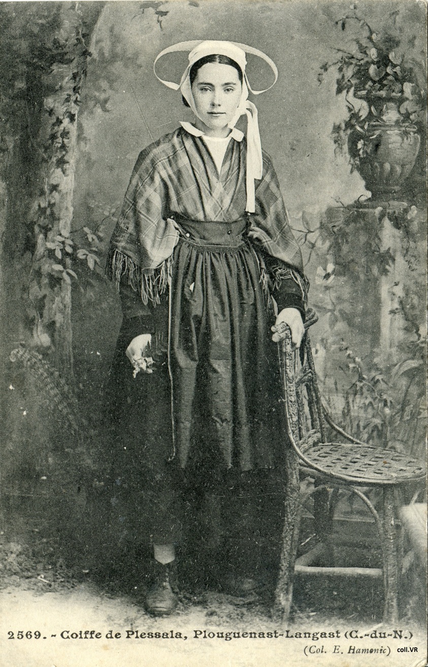Comme en témoignent ces photographies anciennes, la coiffe au XIXe siècle se compose notamment de longues ailes repliées sur le haut de la tête. Celles-ci se réduiront de beaucoup, alors que les mentonnières deviendront plus larges et plus longues formant un nœud relativement imposant sur le côté gauche. Collection CPA de Vincent RousselImmatriculation
