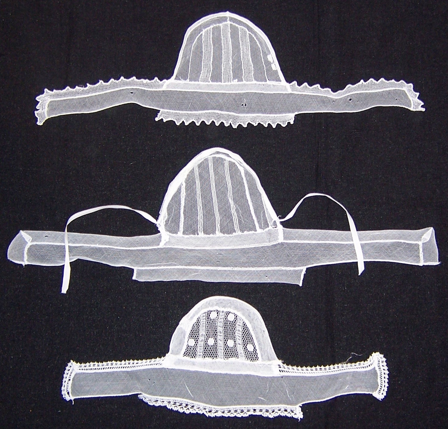 Trois coiffes avec une structure identique aux deux autres, mais avec des matières différentes, essentiellement tulle et organdi. Pour toutes ces coiffes, on remarque la pièce de renfort entre le fond et la visagière. Collection Frédéric Raffray. (Photo H.Saillour)Immatriculation