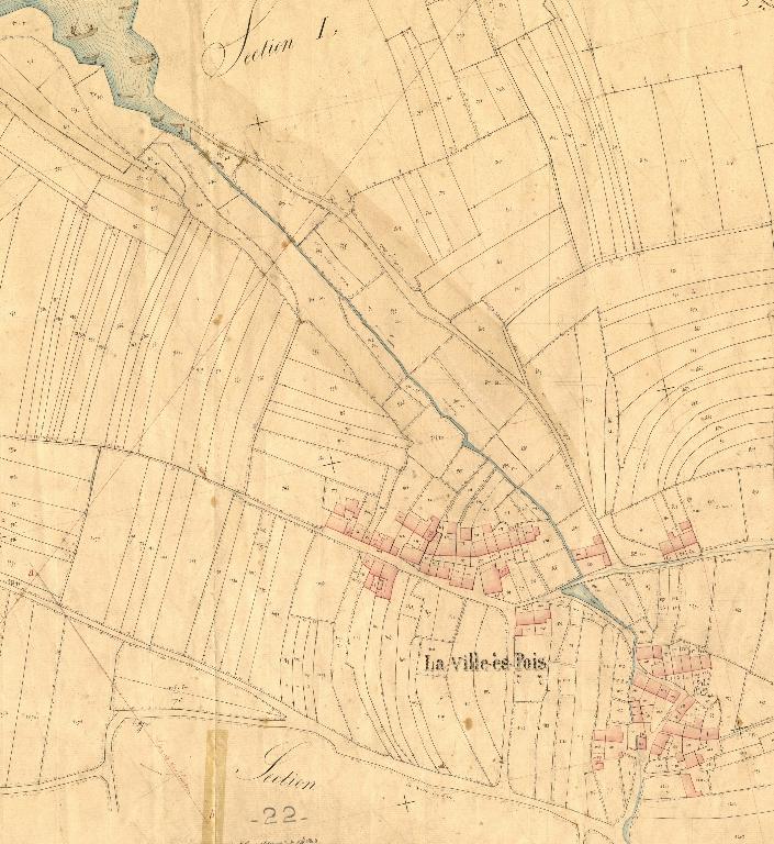 Extrait du cadastre de 1844, implantation de part et d'autre du ruisseau de la Ville-es-Pois (A.D.22)Immatriculation