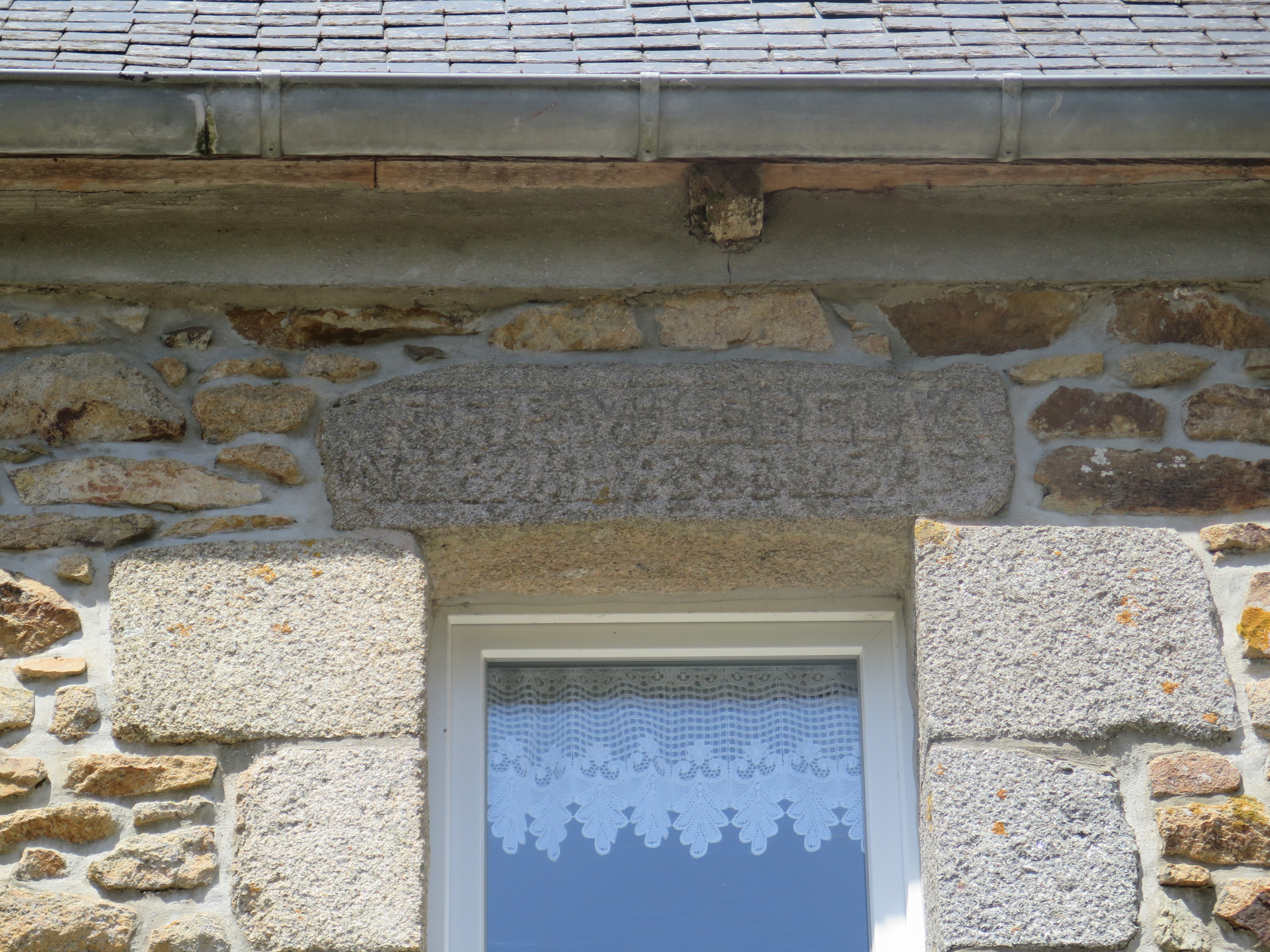 Rospez, Convenant Groac'h : logis de ferme, élévation sud, détail du linteau avec les noms des propriétairesImmatriculation