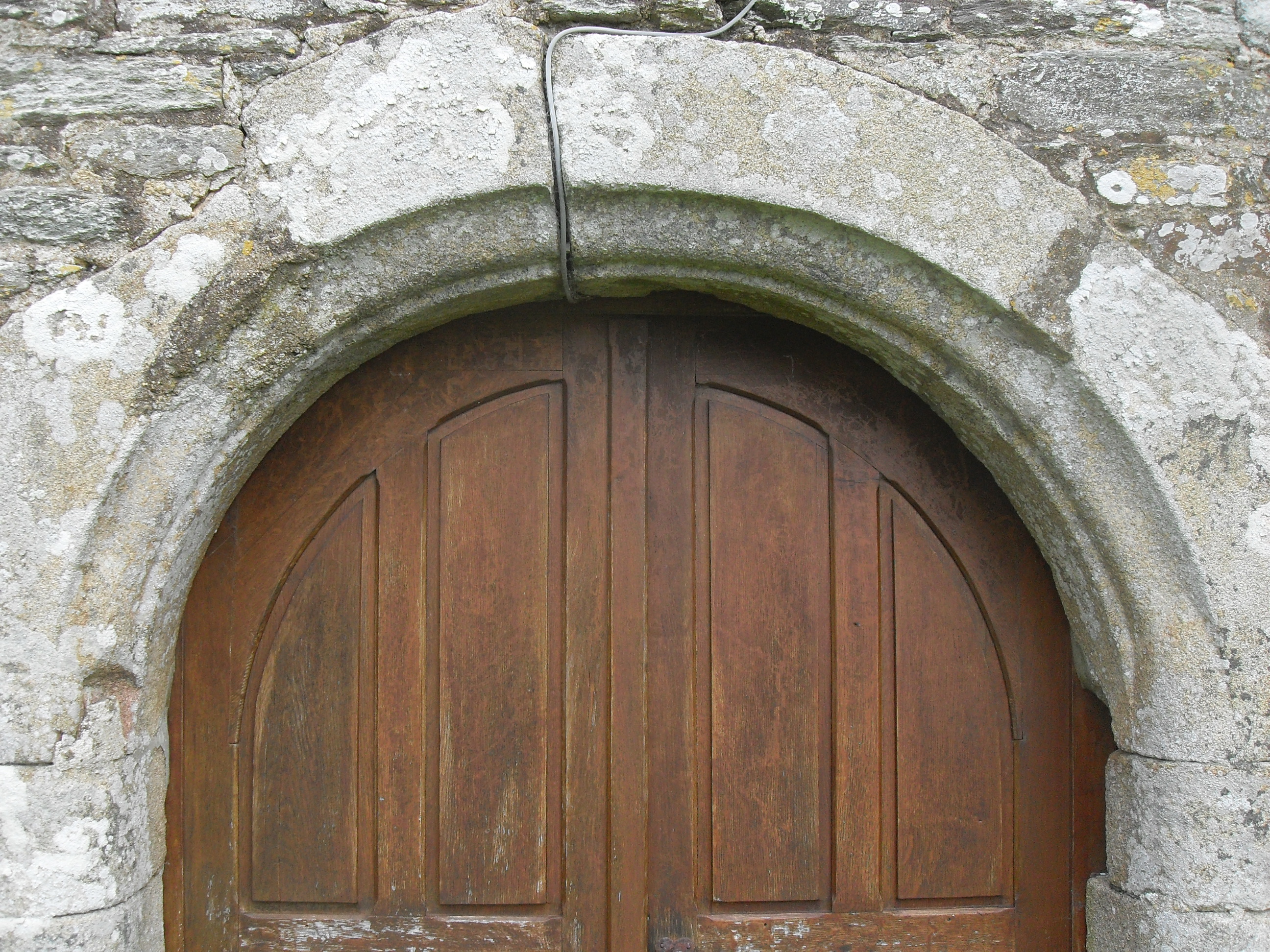 Rospez : chapelle Saint-Dogmaël, mur pignon ouest, détail des moulures de la porte en arc plein cintreImmatriculation