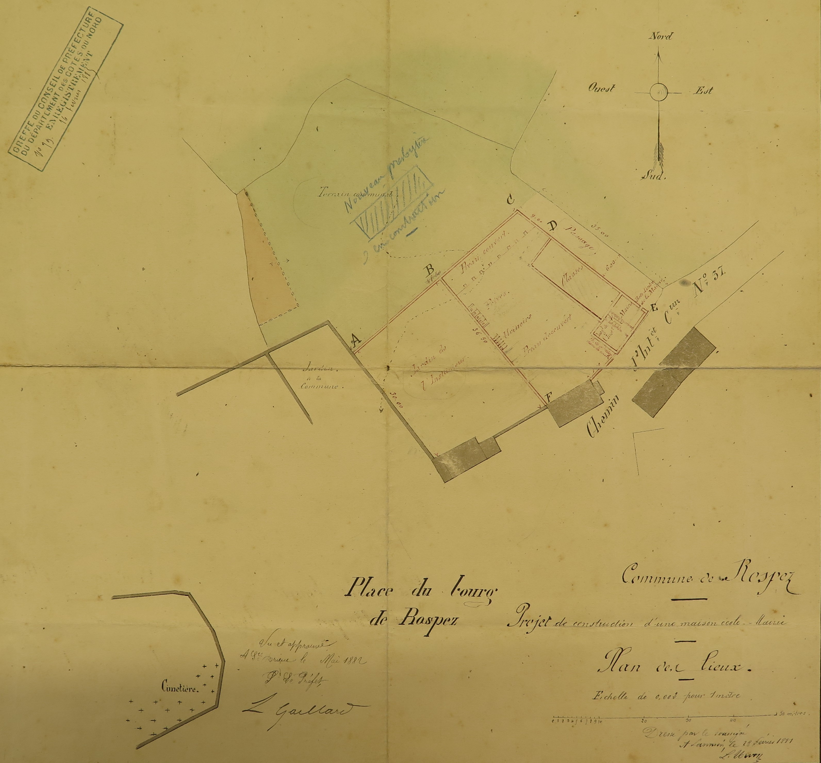 Rospez : plan de 1881 montrant le projet de maison école-mairie et sa place dans le bourg (source : Archives départementales des Côtes d'Armor)Immatriculation