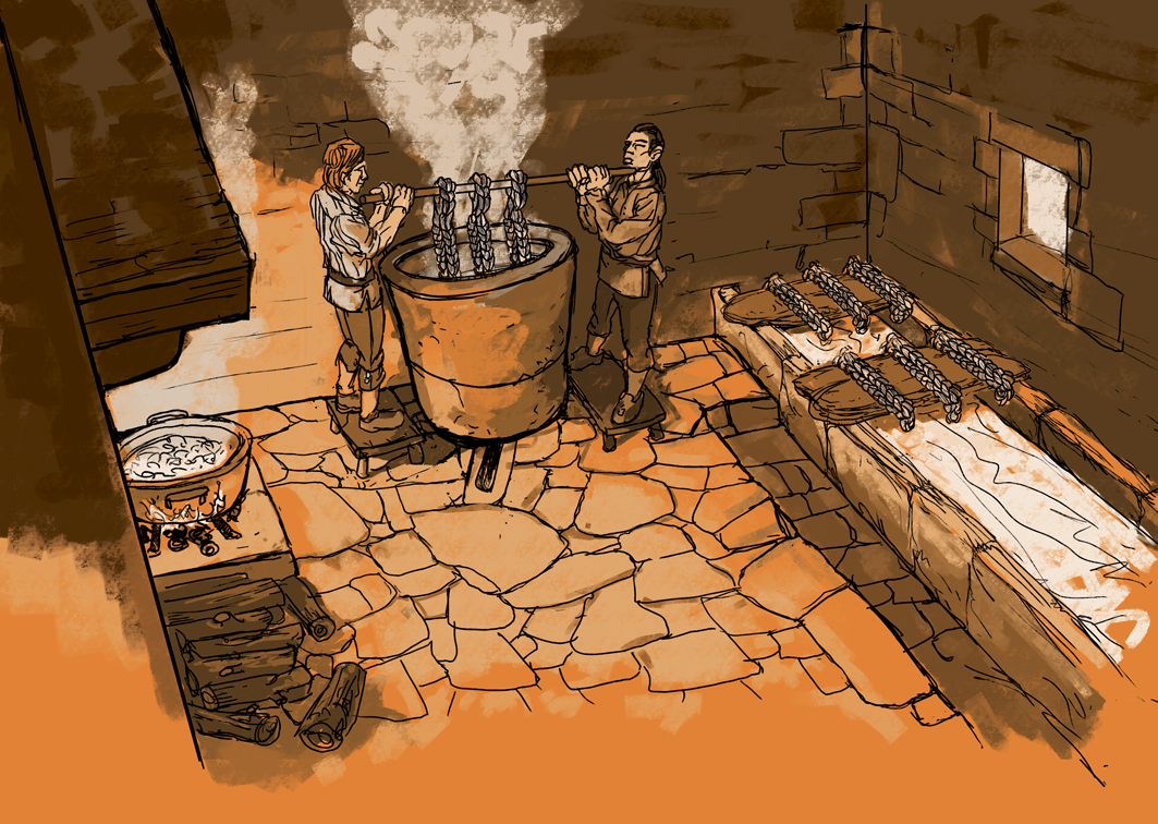 Blanchissage des écheveaux de lin dans un kanndi, dessin de Goulven KentelImmatriculation