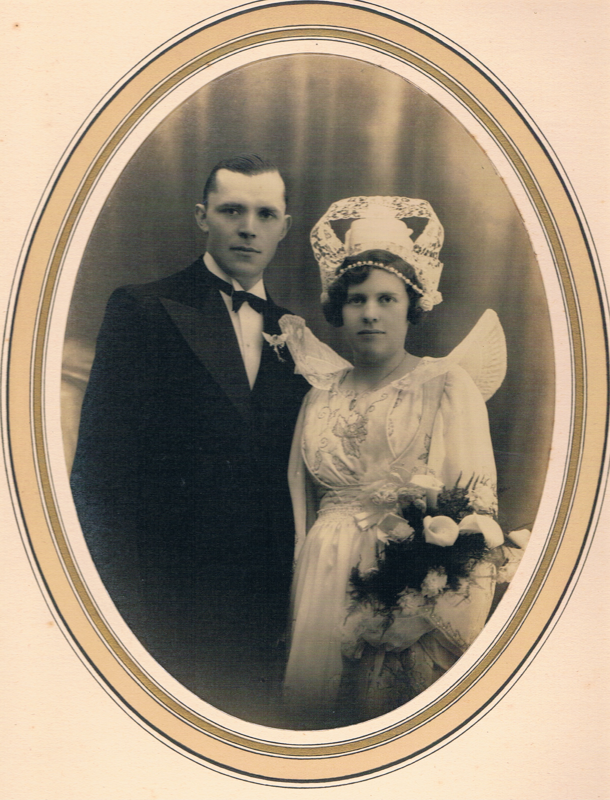 Sur cette photo on distingue bien, pour la coiffe, la mode du secteur de Bannalec. La tenue en velours blanc de la mariée a été teintée en noir après cette cérémonie et la broderie blanche des fleurs refaite en rose. De même pour le tablier. La robe et le tablier sont présentés sur mannequin à la Maison du Filet, Ti ar Roued Brodet, Plouénan 29.Immatriculation