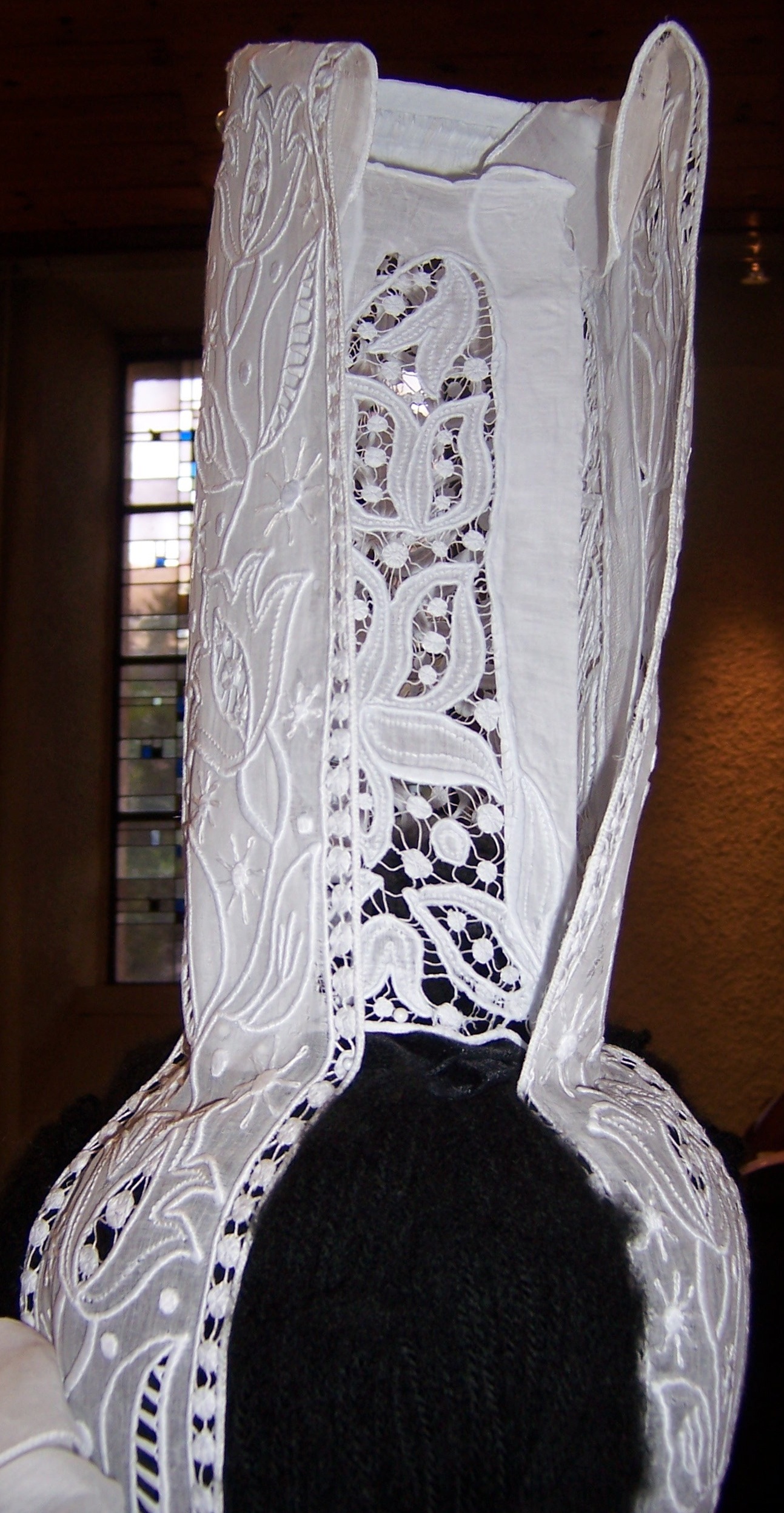 Coiffe en organdi brodé de la collection de Paul Balbous et présentée lors de l' exposition organisée par Bleuniadur dans la chapelle du Kreisker à Saint-Pol de Léon en Juillet 2013. (Photo Ijin ha Spered ar Vro)Immatriculation