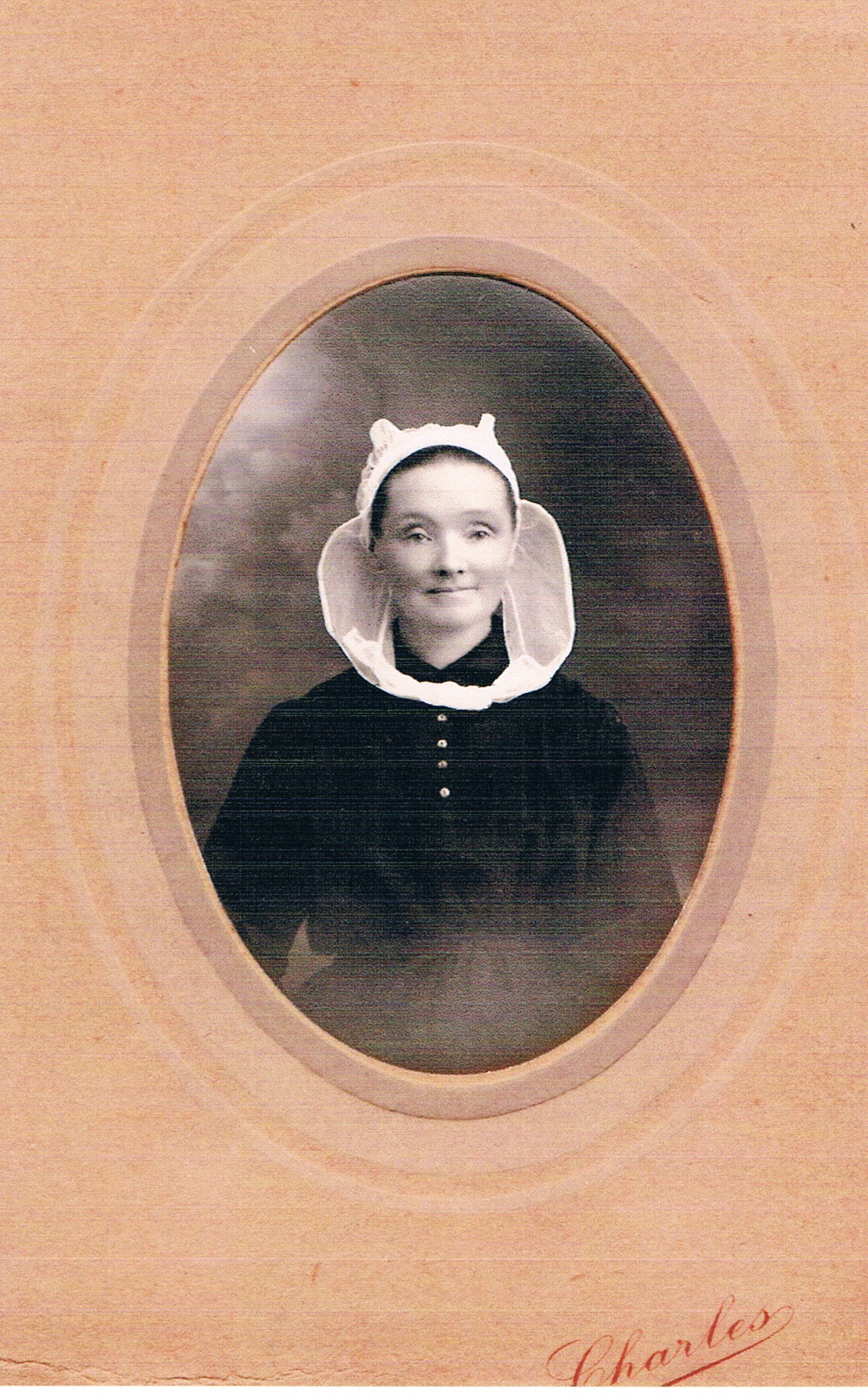 Une roscovite avec une coiffe aux barbes courtes, mode du début du XXième siècle. Photo famille ANQUET de Roscoff.Immatriculation