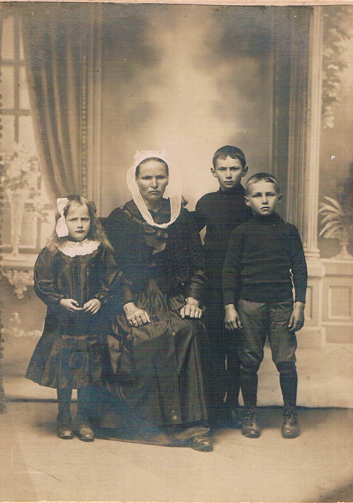 Annette SÉVÈRE épouse MÉVEL avec ses trois enfants. Aline sa fille née en 1911. Photo prise durant la guerre de 1914-18.Immatriculation