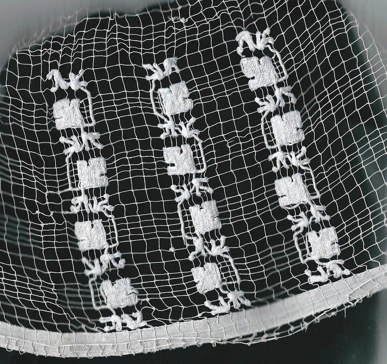 Collectage de l'association Ijin ha Spered ar Vro. Fond de Sparlenn brodé sur filet irrégulier, base de la majorité des coiffes de ce territoire. Broderie guipure ou filet d'art. Coiffe du cercle celtique des Lapoused ar Menez de Sizun.Immatriculation
