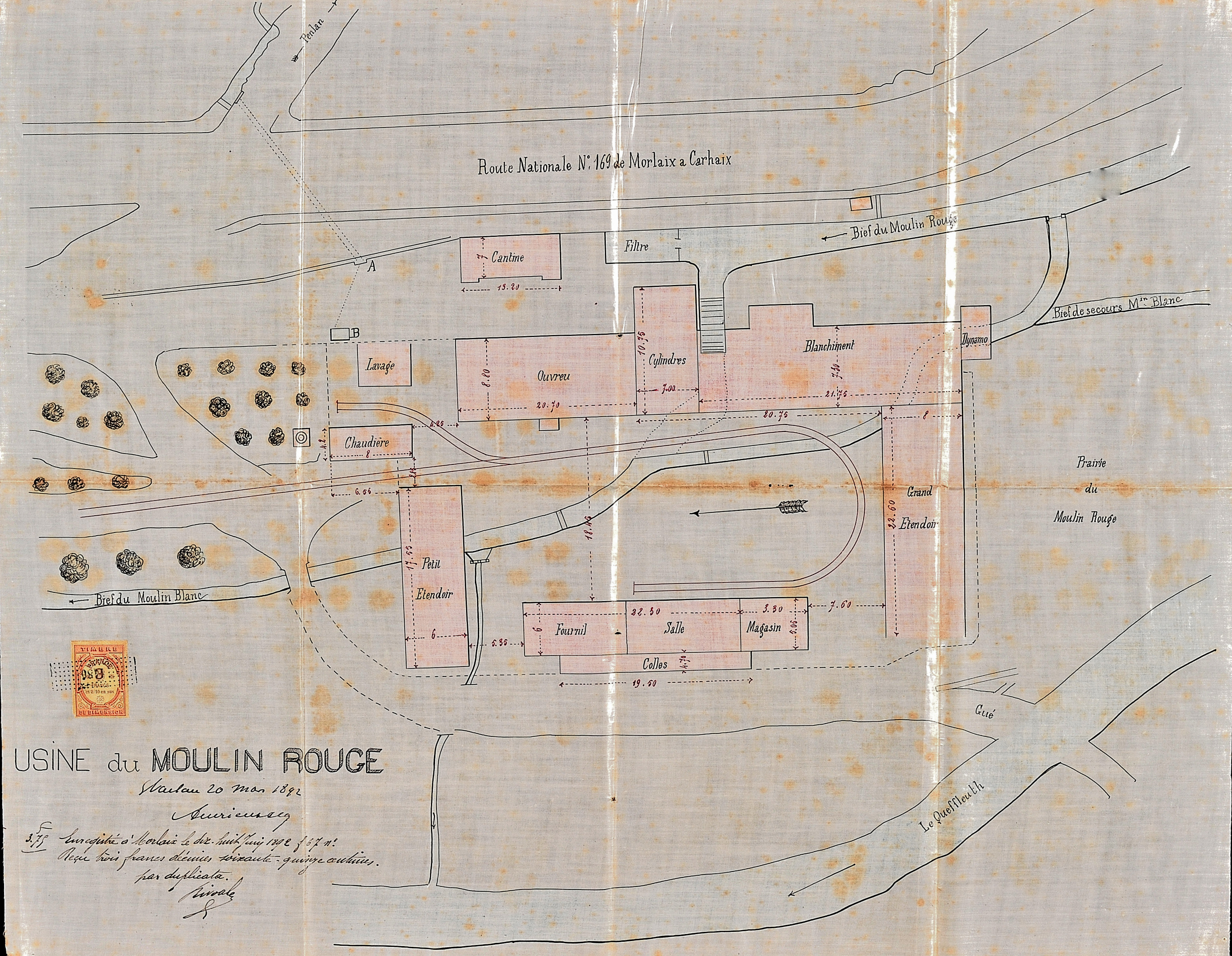 Plan de l'usine de Moulin Rouge, annexe de la papeterie de Glaslan, du 20 mars 1892 (Cote : 4E 132 189)Immatriculation