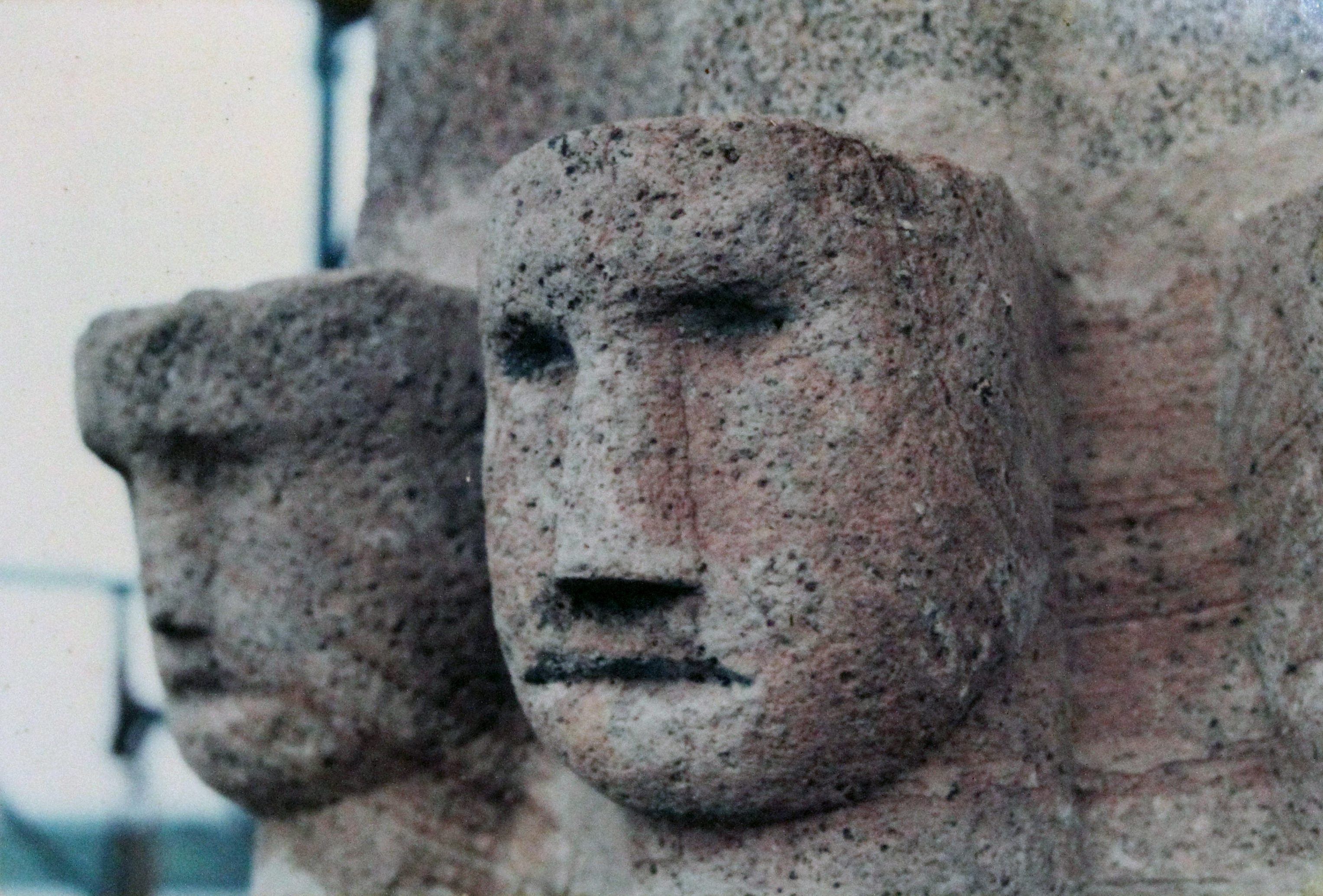 Logonna-Daoulas, chapelle Saint-Jean - Détail de deux mascarons de la flèche du clocher, état pendant travaux de restaurationImmatriculation
