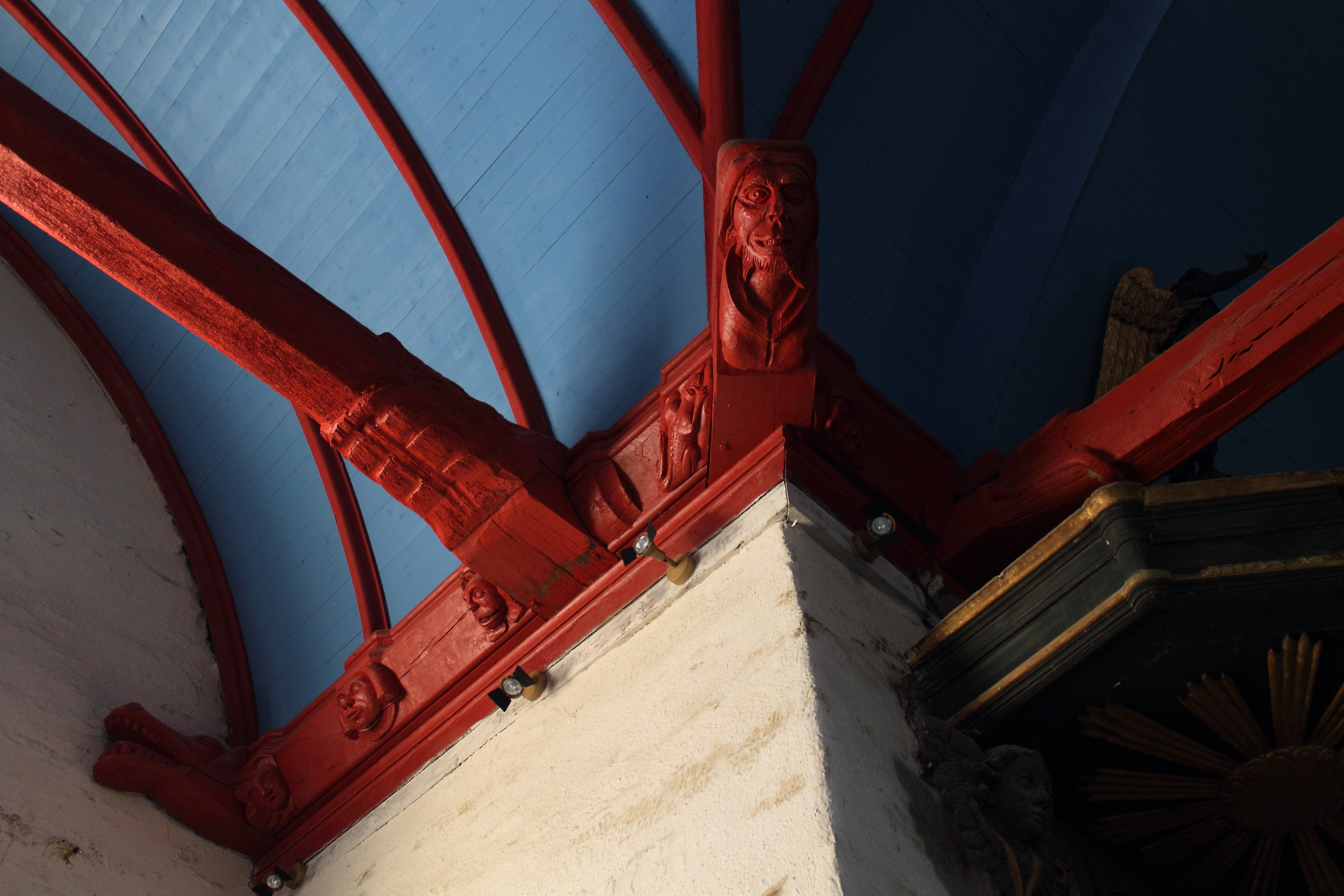 Saint-Coulitz, église paroissiale - vue intérieure, détail des sablières du transeptImmatriculation