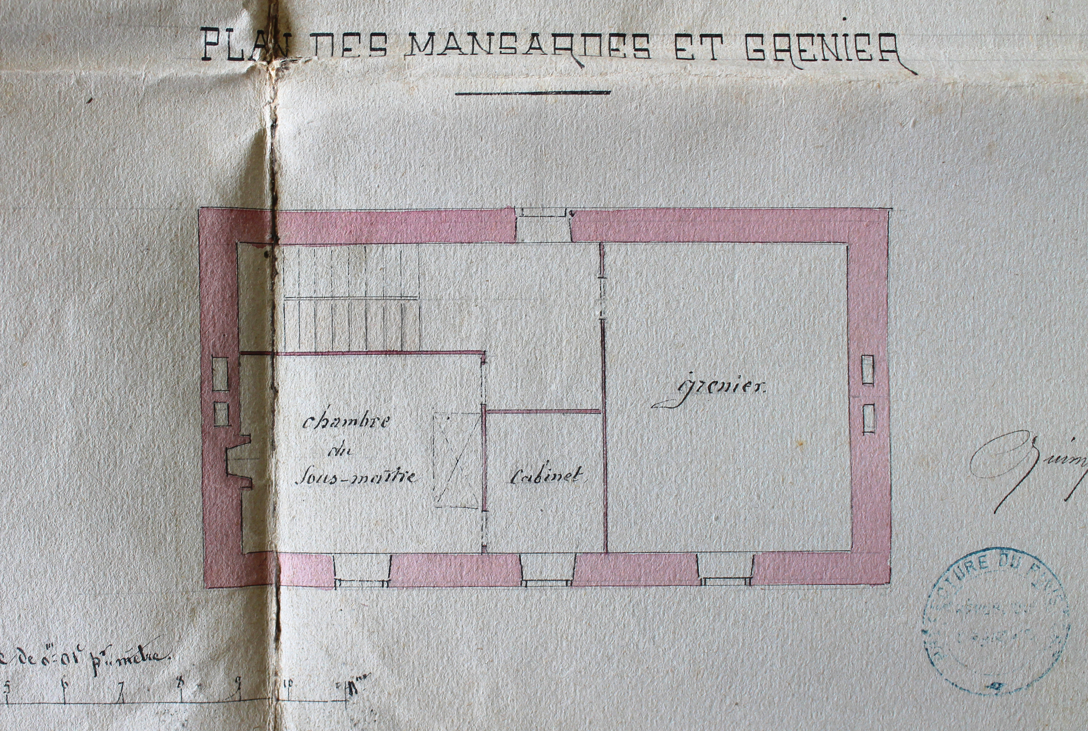 Daoulas, ville - Projet d'école de garçons, plan des mansardes et grenier, dressé les 30 octobre 1882 et 16 juin 1884, approuvé le 11 avril 1885 (AD29 - 512 E DEPOT art.21)Immatriculation