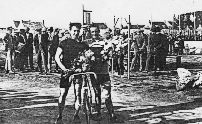 Deux coureurs cyclistes posent bouquet à la main (1926)Immatriculation
