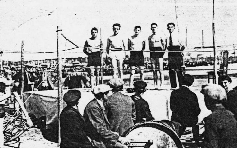 Quatre boxeurs et un juge sur le ring de boxe installé au centre de la piste (1926)Immatriculation