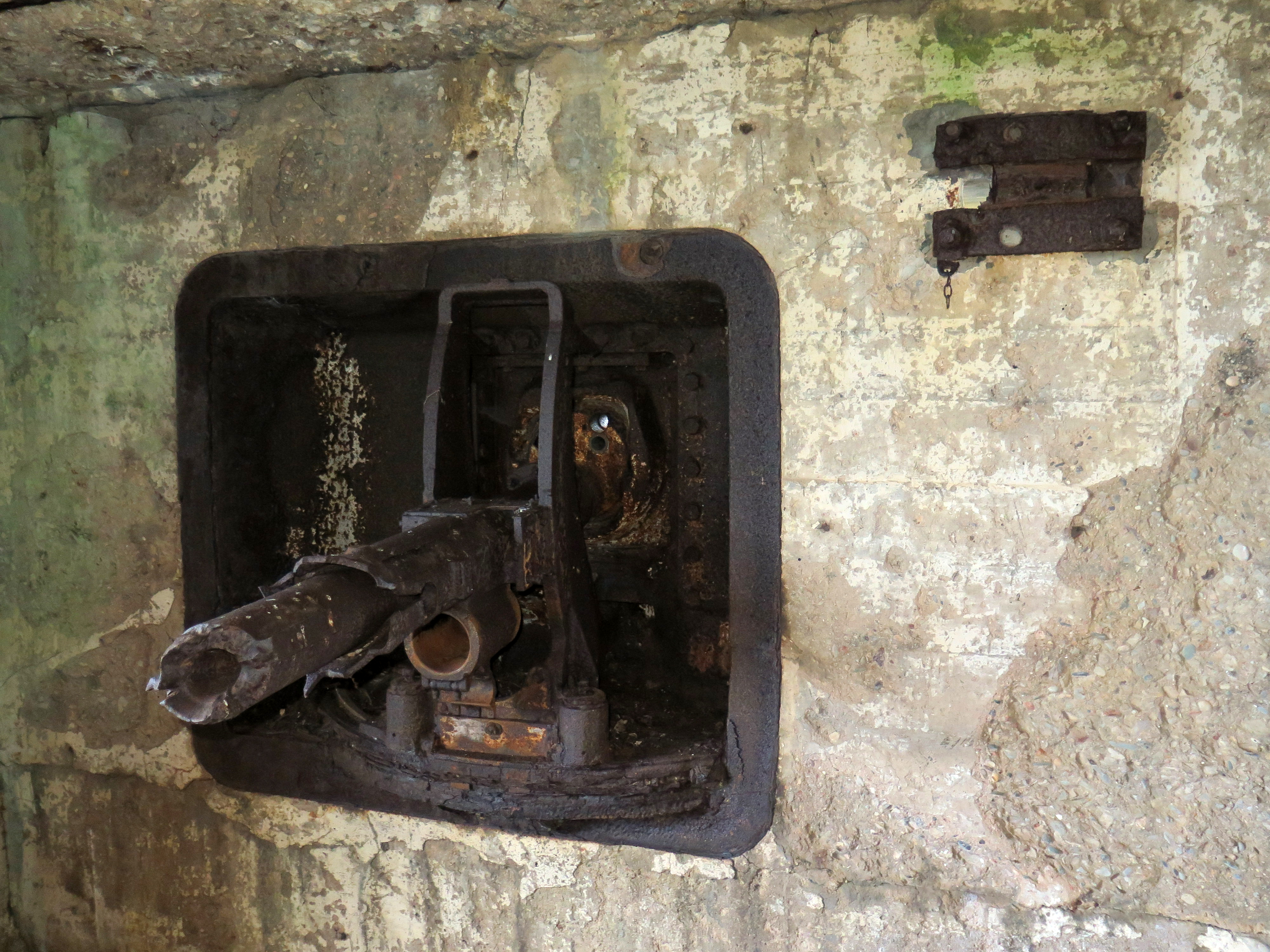 Landéda, fort Cézon : casemate pour arme mixte (canon antichars de 4,7 cm et mitrailleuse de calibre 7.92 mm), canon Skoda en place. Il a été saboté par pétardageImmatriculation