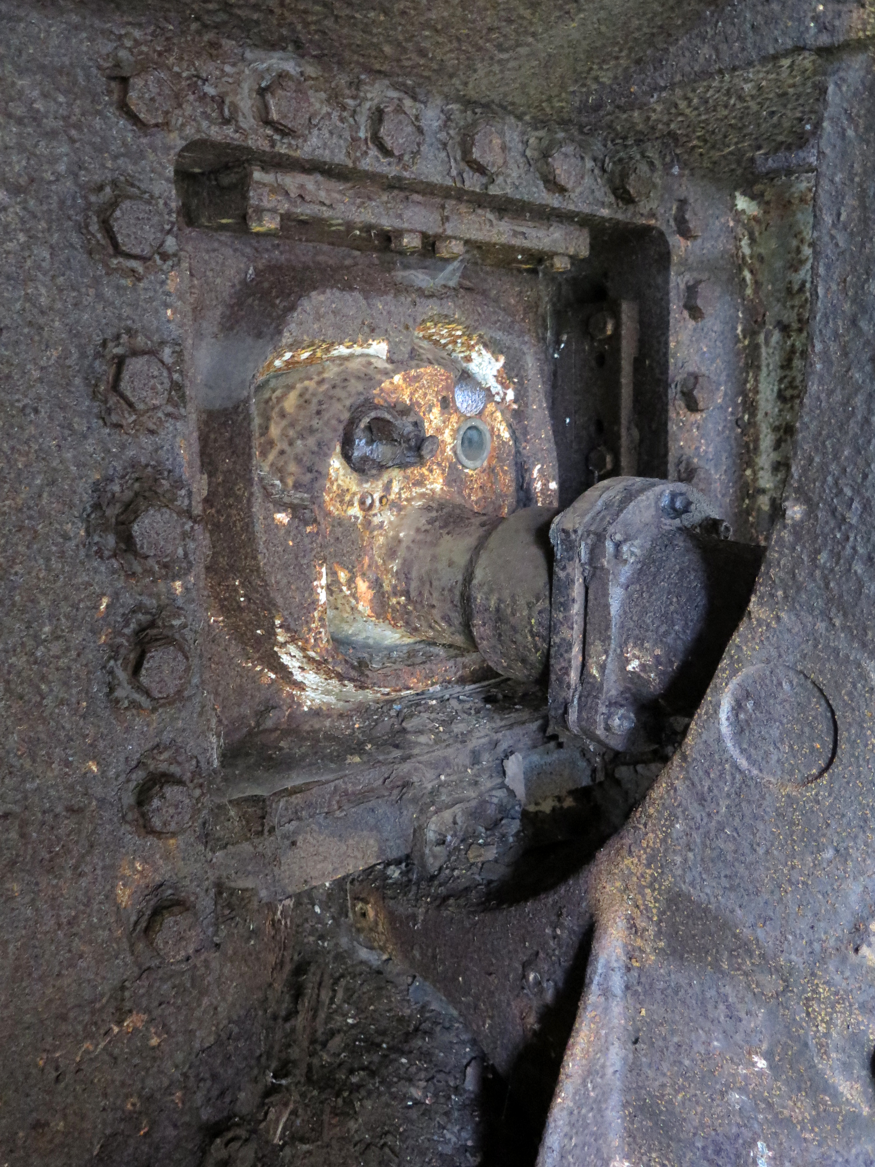 Landéda, fort Cézon : casemate pour arme mixte (canon antichars de 4,7 cm et mitrailleuse de calibre 7.92 mm), canon Skoda en place, détail de l'arrière de la rotule blindéeImmatriculation