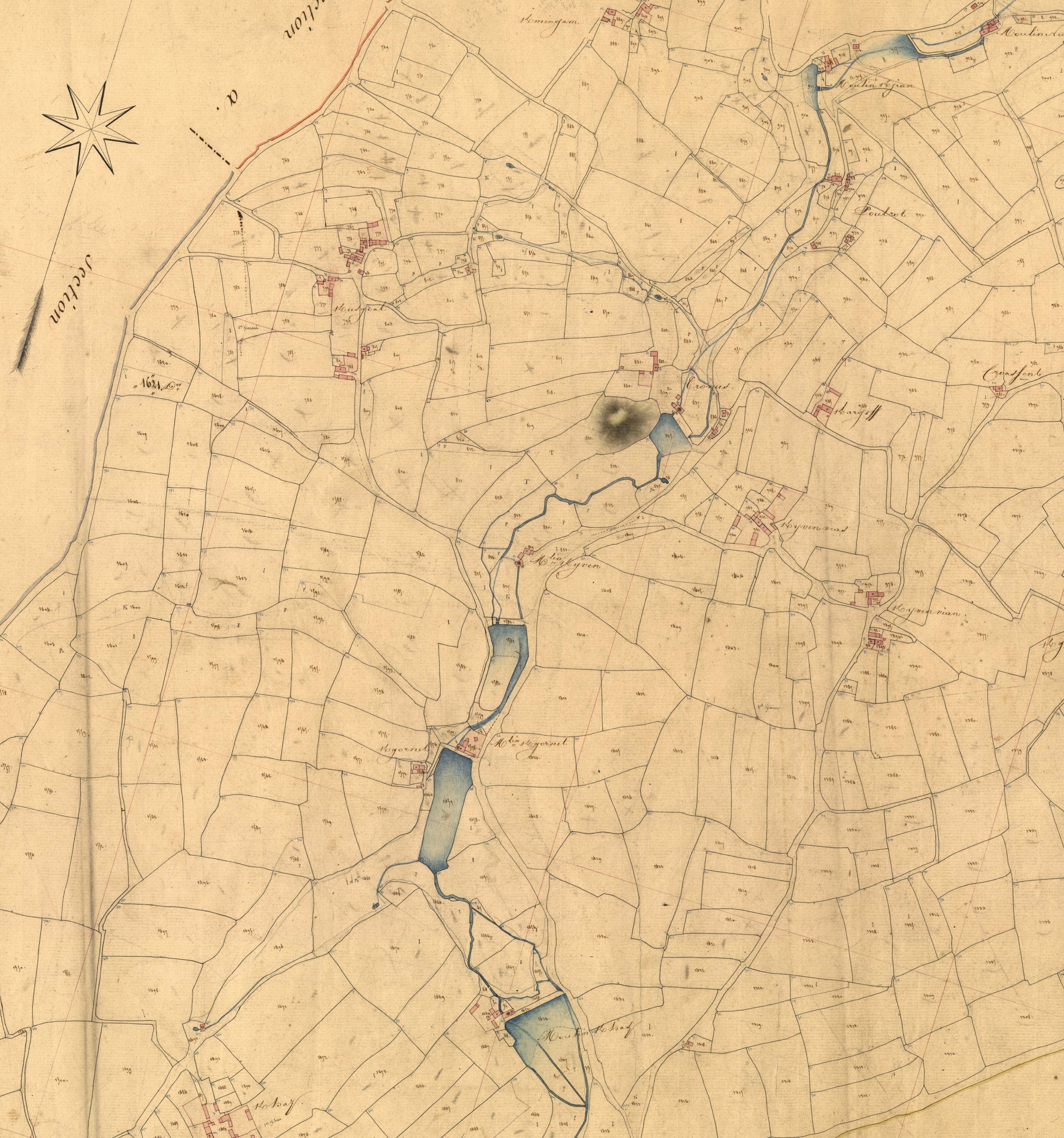 Les moulins sur le ruisseau de Kerrus, sur le cadastre de 1837 (A. D. du Finistère, 3 P 207/6)Immatriculation