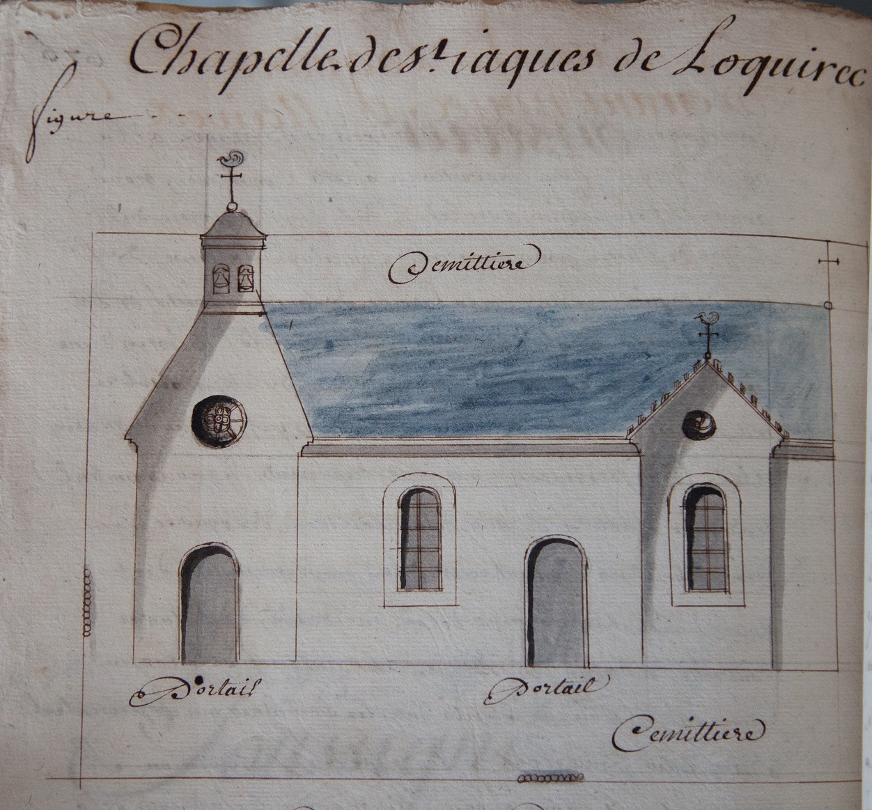 Chapelle de Saint-Jacques de Locquirec. Dessin à la plume aquarellé, 1731 (A. D. de La Vienne, 3H1 448)Immatriculation