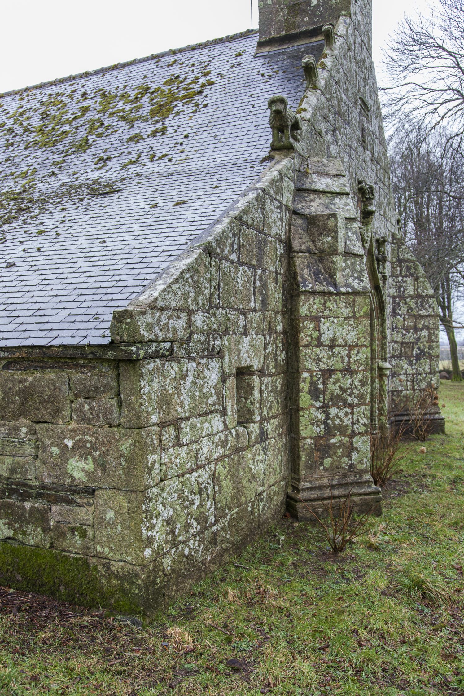 Chapelle Saint-Jean-Botlan, Edern - détail du collage entre le mur pignon du bas-côté et la façade occidentaleImmatriculation