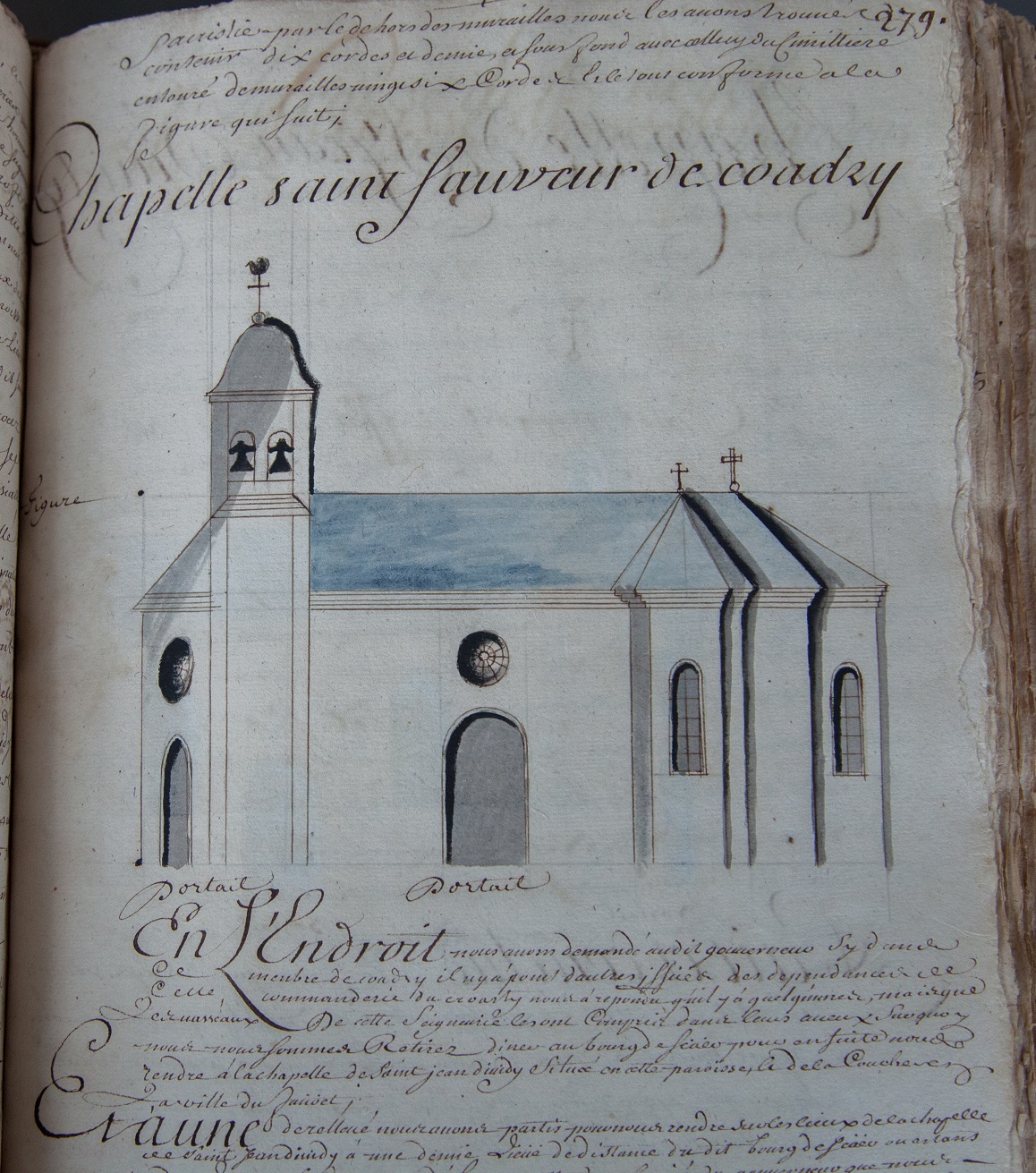 Chapelle de Saint-Sauveur de Coadry. Dessin à la plume aquarellé, 1731 (A. D. de La Vienne, 3H1 44?)Immatriculation