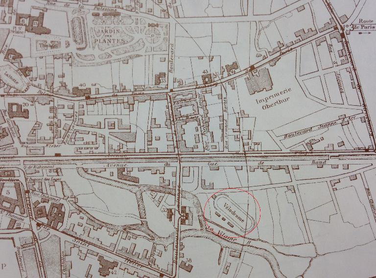 Extrait d'un plan de Rennes avec le tracé du vélodrome Laënnec (après 1897)Immatriculation