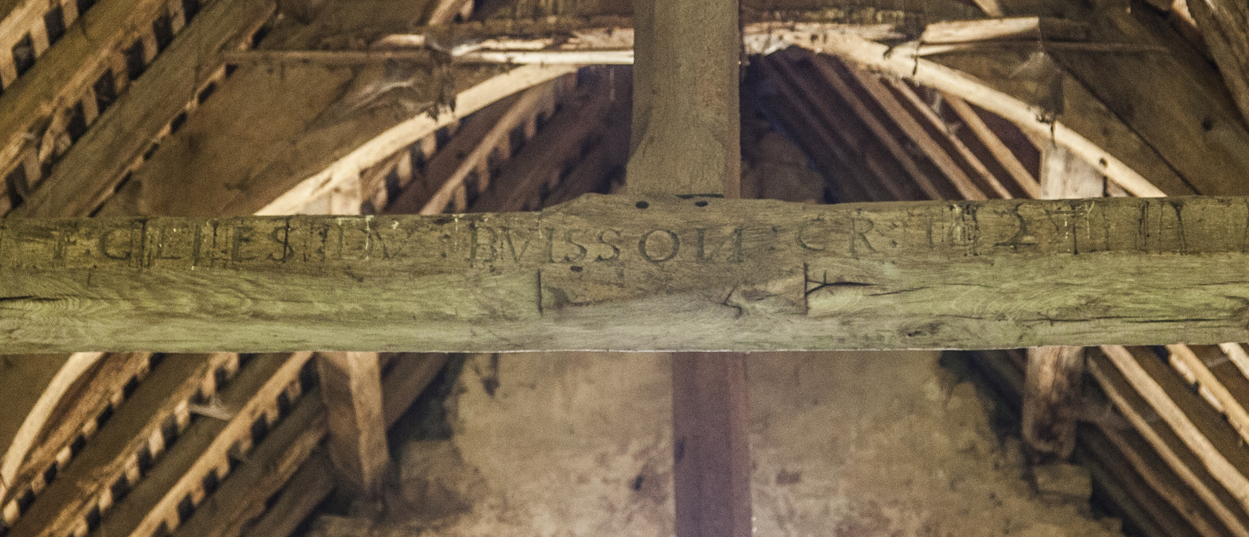 Inscription sur le deuxième entrait de la nef, chapelle de La CoëfferieImmatriculation