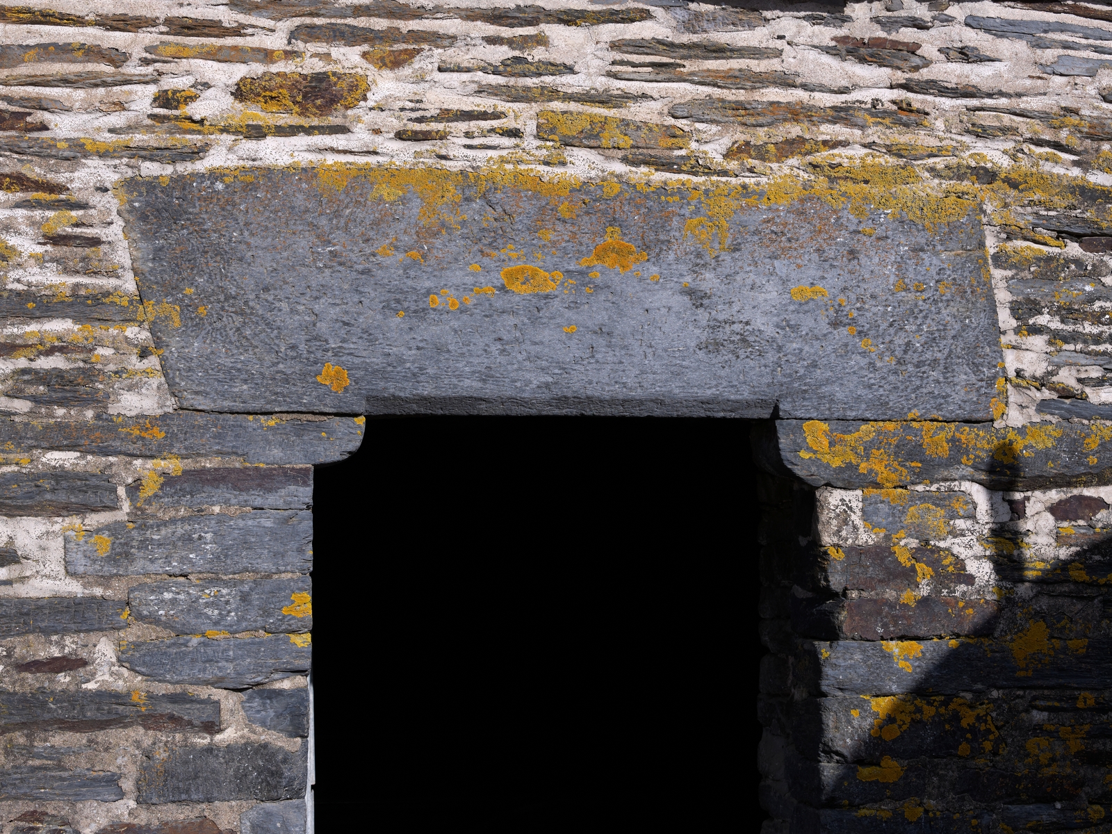 Manoir, aujourd'hui dépendance de ferme : le linteau en schiste de la porte repose sur des coussinets (état en 2015)Immatriculation