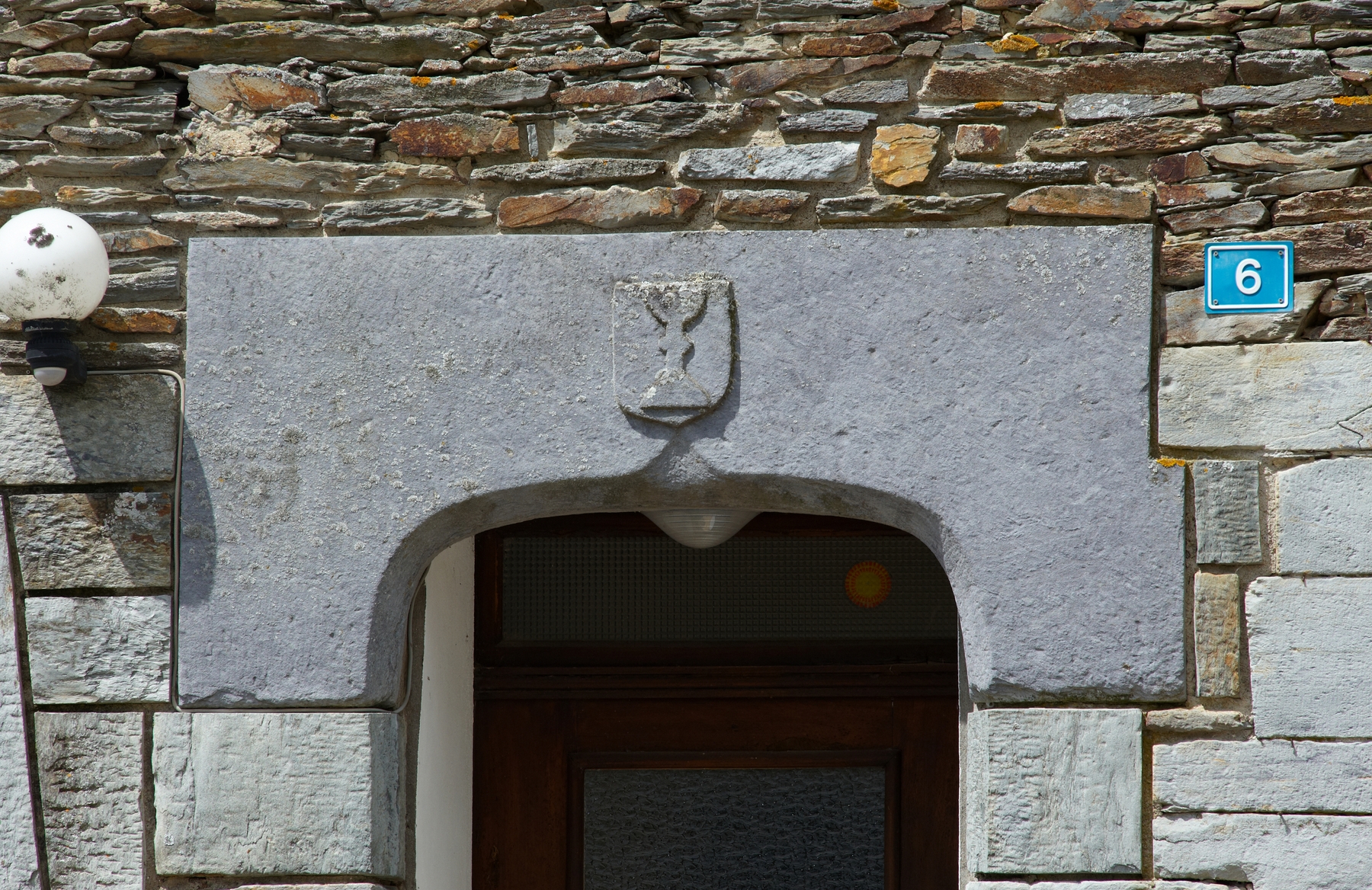 6, Place de la Motte, presbytère aujourd'hui maison : linteau de la porte orné d'un calice (état en 2015)Immatriculation
