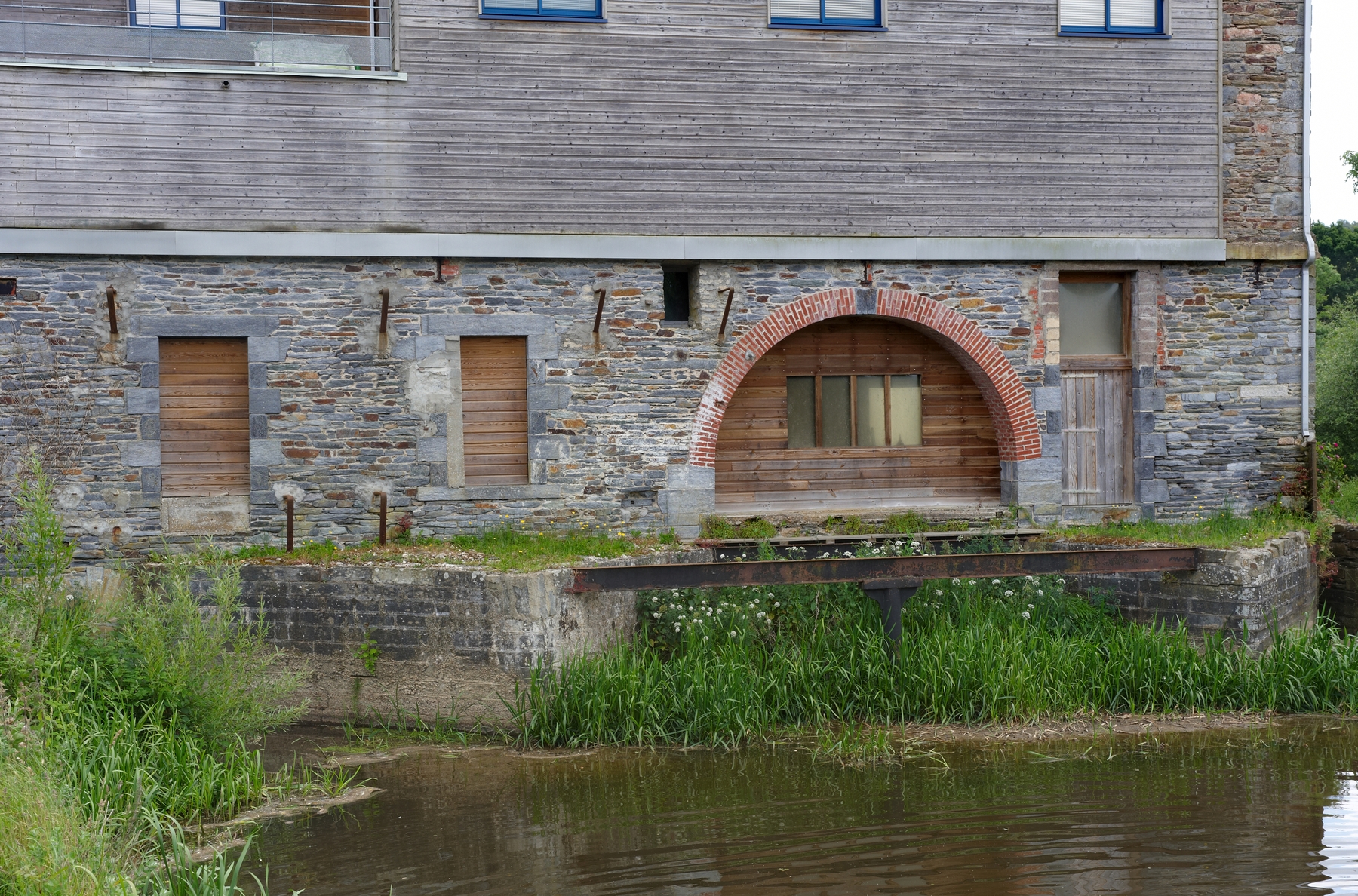 Minoterie, aujourd'hui maison : élévation nord-ouest ; le canal d'évacuation passait sous l'arc de brique et l'eau retournait à la rivière (état en 2015)Immatriculation