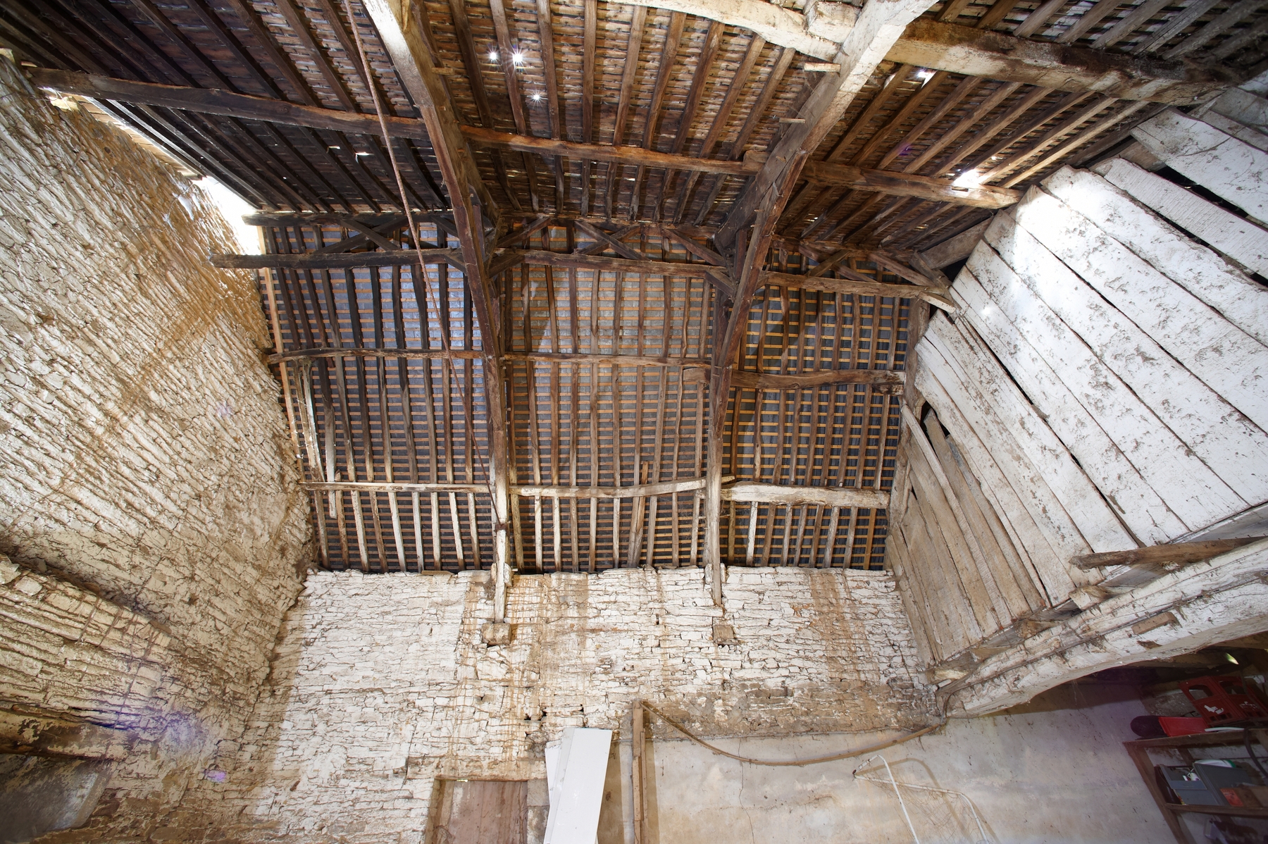Manoir de la Touche ronde : la charpente actuelle de la salle (état en 2015)Immatriculation