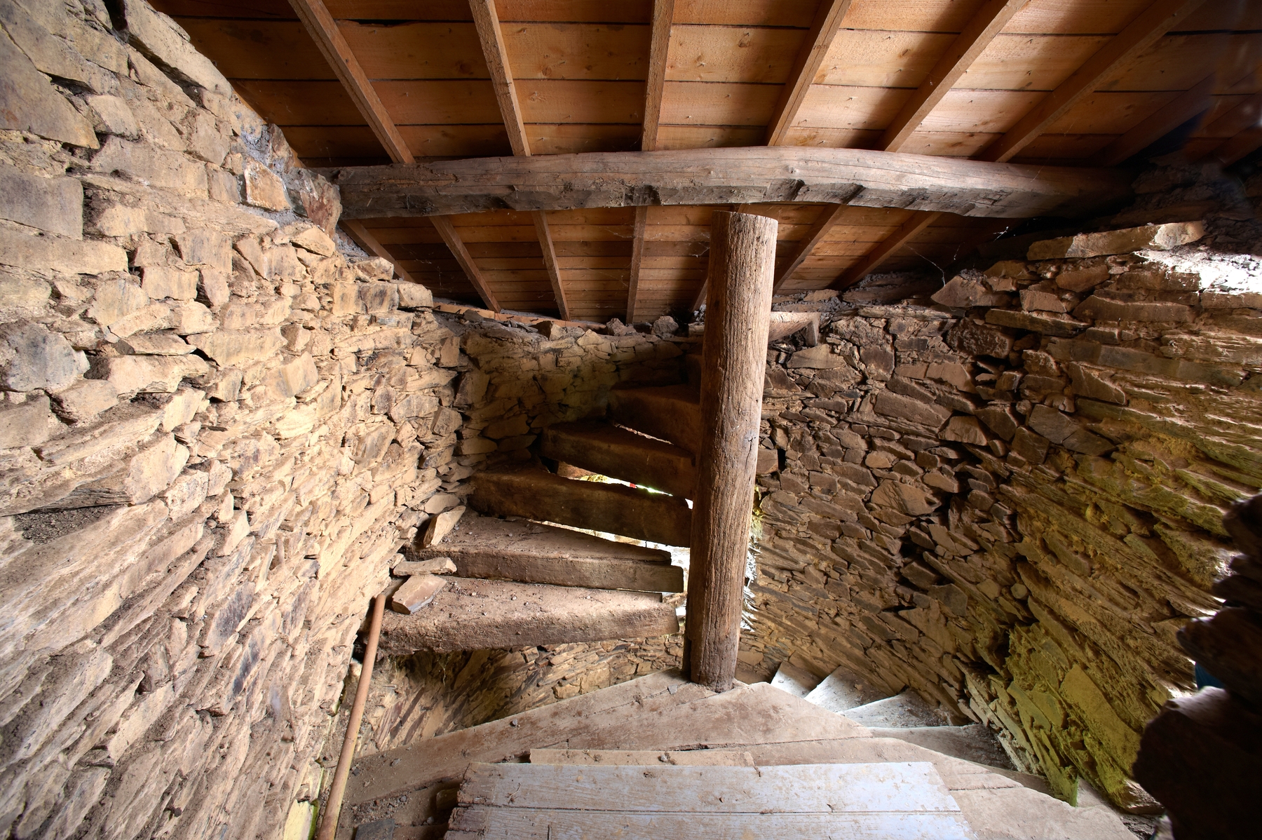 Manoir : sommet de l'escalier en vis ; il se prolongeait peut-être vers l'espace de comble qui a aujourd'hui disparu (état en 2015)Immatriculation