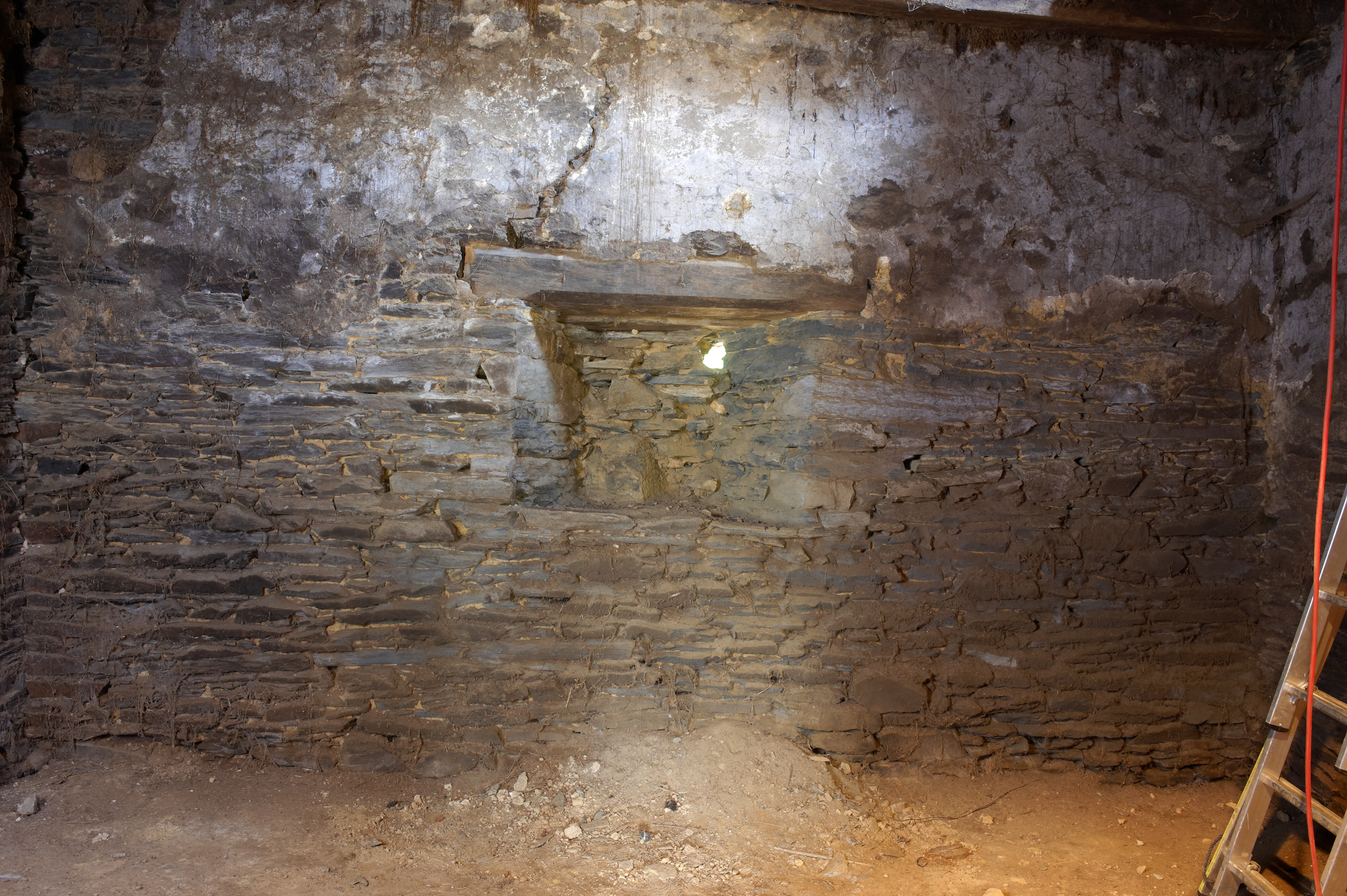 Manoir, aile ouest, rez-de-chaussée : cellier, mur ouest ; au centre, le placard mural commence d'apparaître (état en 2015)Immatriculation
