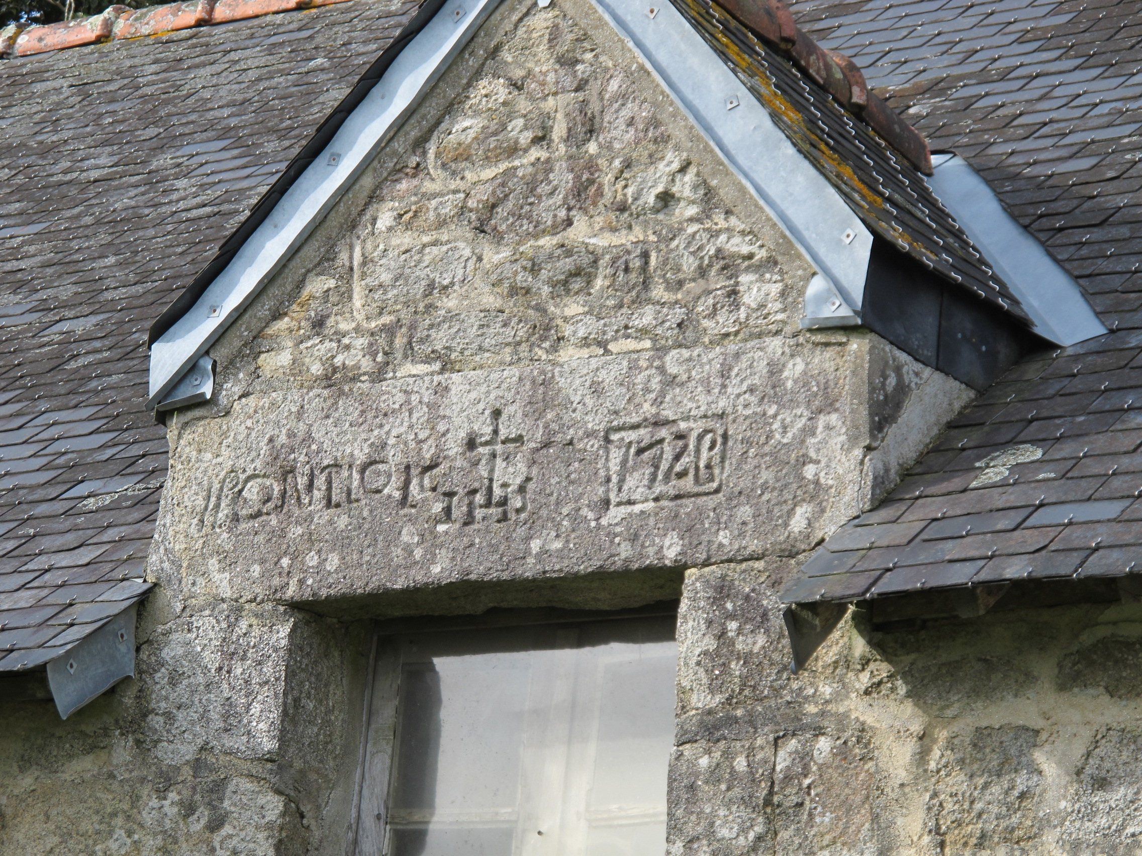 Logis ouest, élévation sud, détail de l'inscription sur le linteau de la lucarneImmatriculation