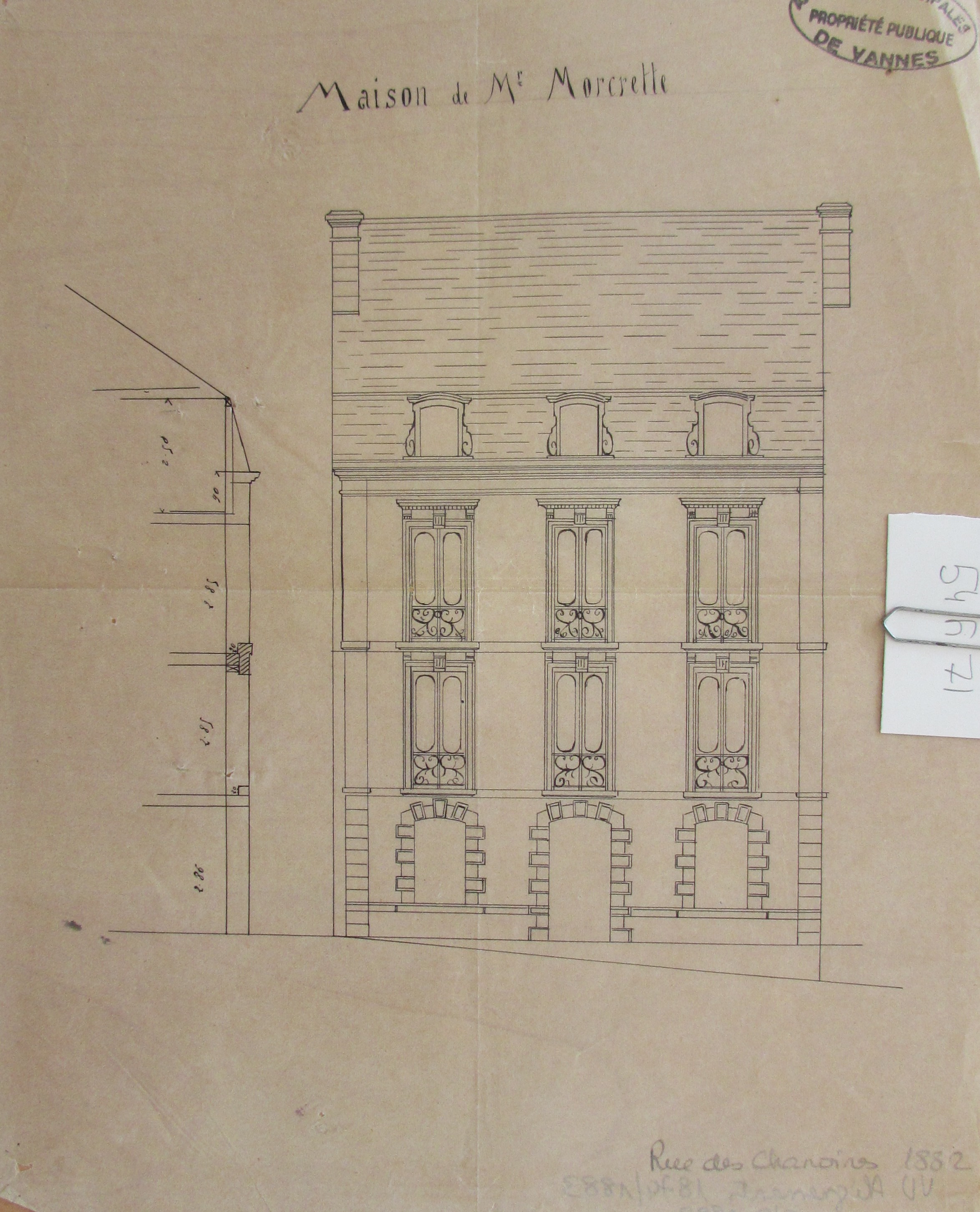 Elévation de la façade de la maison Morcrette, s.d. vers 1878. AM Vannes 54Fi71.Immatriculation