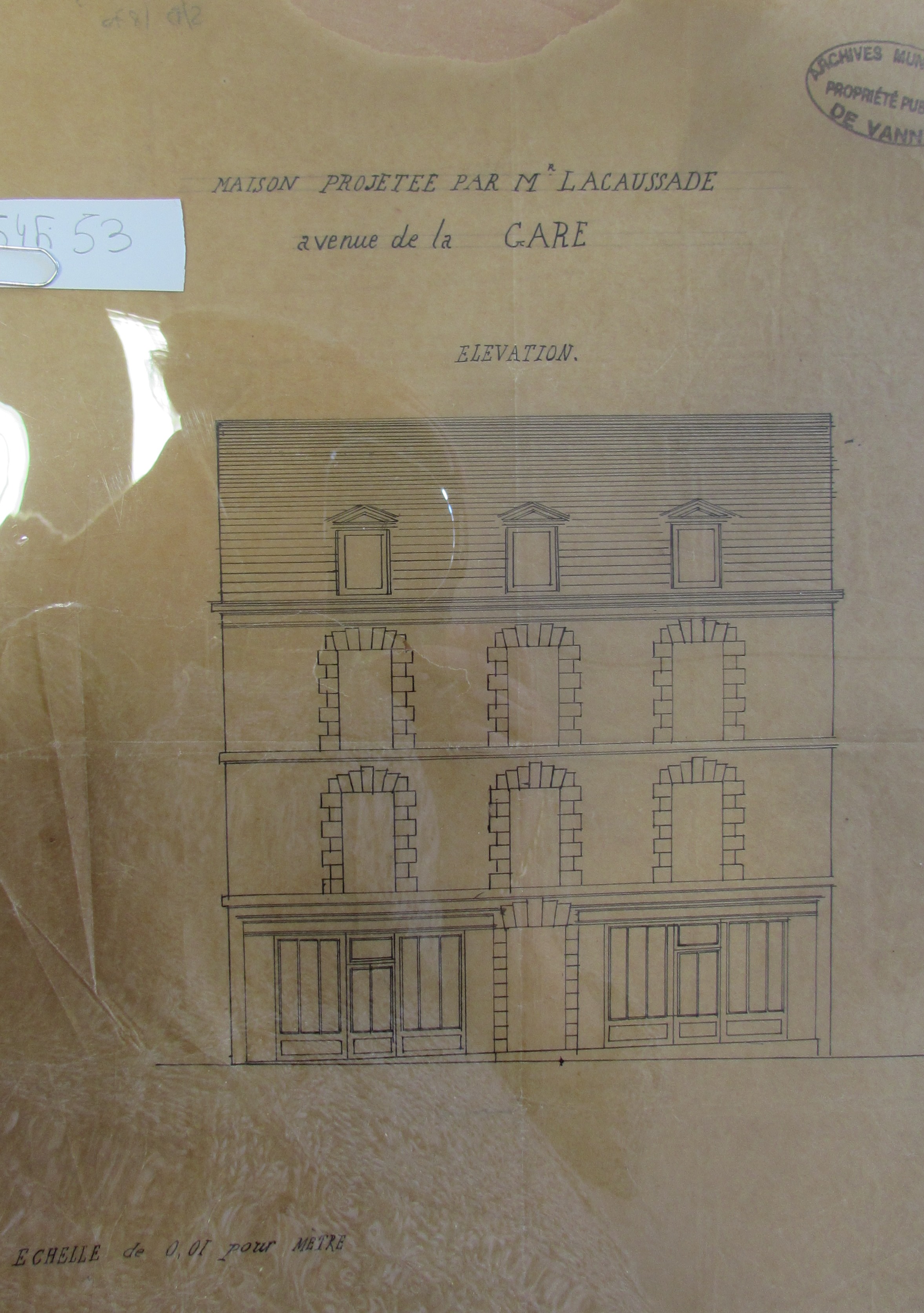 Elévation de la façade de la maison de Julien Lacaussade, s.d. vers 1872. AM Vannes 54Fi.Immatriculation