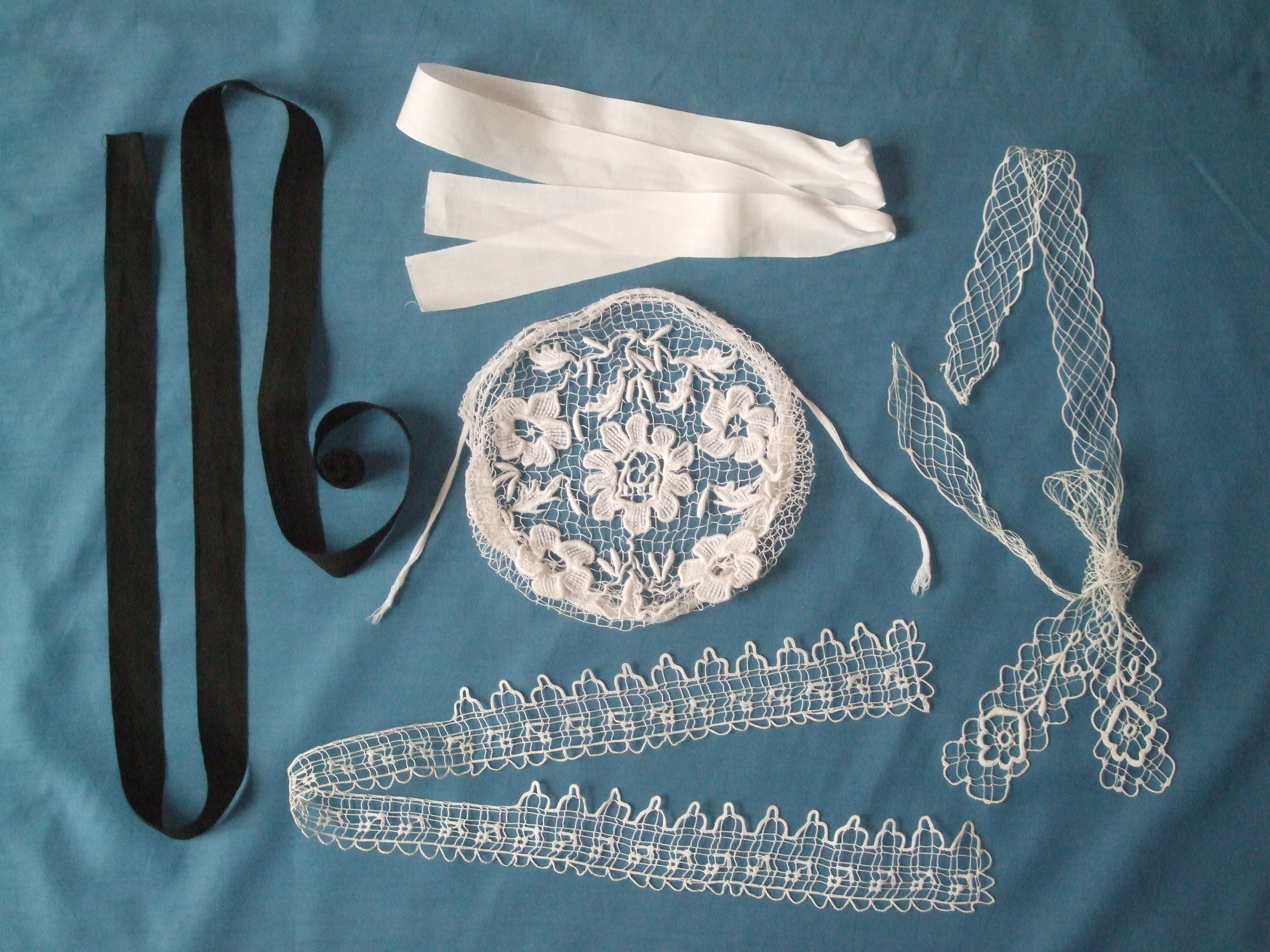 Tous les éléments composant la coiffe de campagne de Poërmel. Voir le lien collectage. Photo de Michel Rocher.Immatriculation