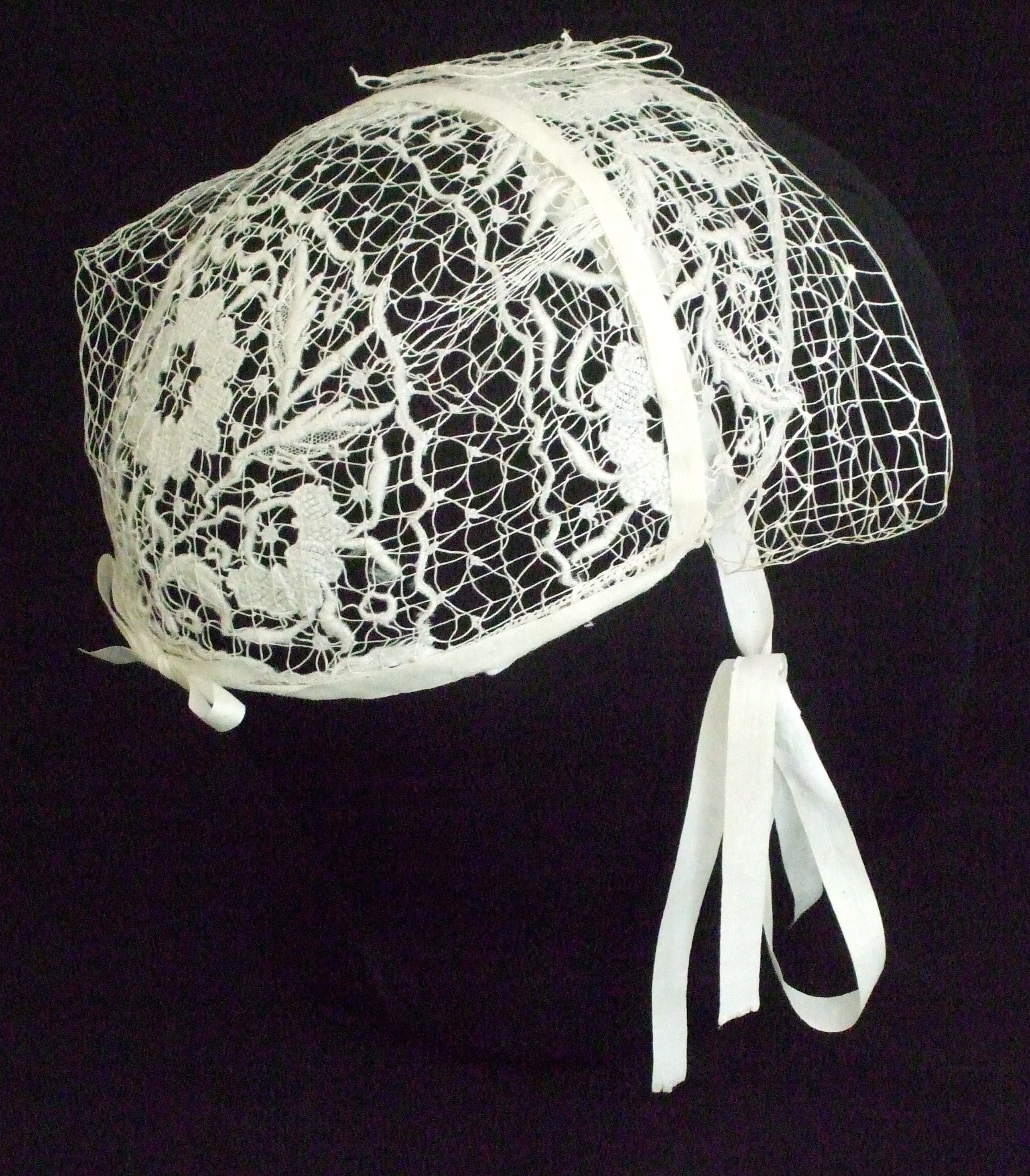 Cette coiffe se porte sur un bonnet, ou sous-coiffe, qui enveloppe le haut de la tête. La coiffe proprement dite est composée d’un fond et de deux ailes partant de la visagière, ailes qui se replieront sur le devant de la tête, contrairement à celles de Questembert-Muzillac qui se replient à l’arrière.Photo de Michel RocherImmatriculation