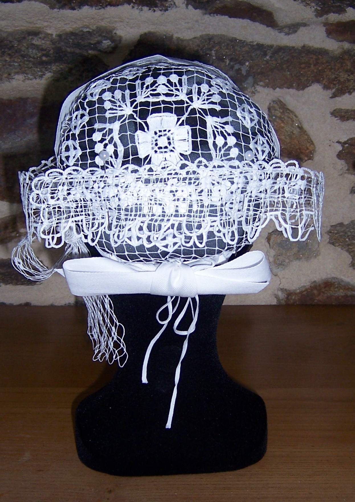 Coiffe de campagne de Ploërmel vue de dos. Reproduction récente d'ijin ha Spered ar Vro.Immatriculation