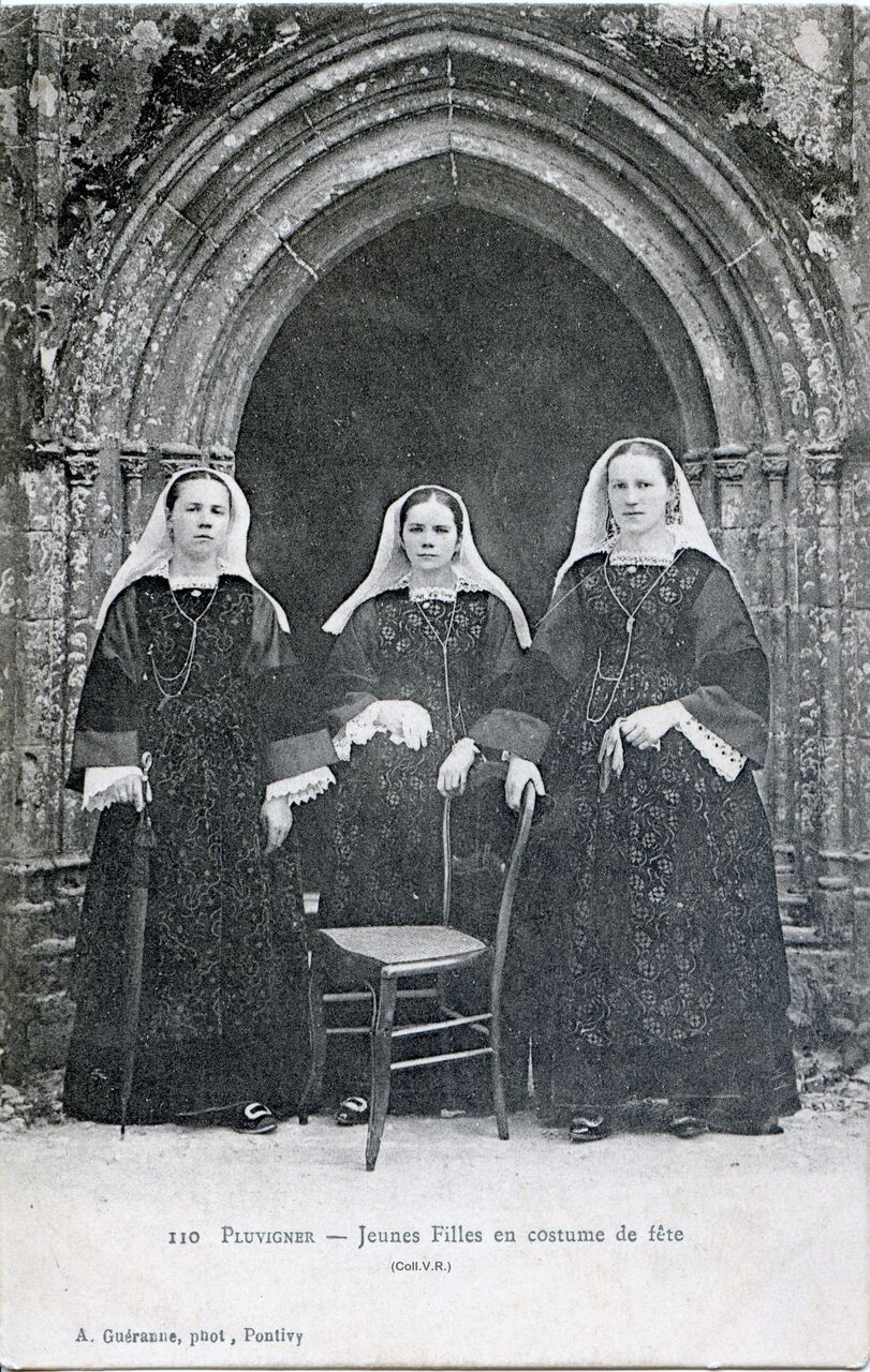 Femmes de Pluvigner en kornek (avant qu’elles ne quittent la mode de Baud pour adopter celle de Vannes-Auray, après 1910). Cols et guimpes très ouvragés, en broderie sur tulle. On remarque par ailleurs la taille de la bavette du tablier, beaucoup plus importante qu’à Baud. (Collection de CPA de Vincent Roussel)Immatriculation