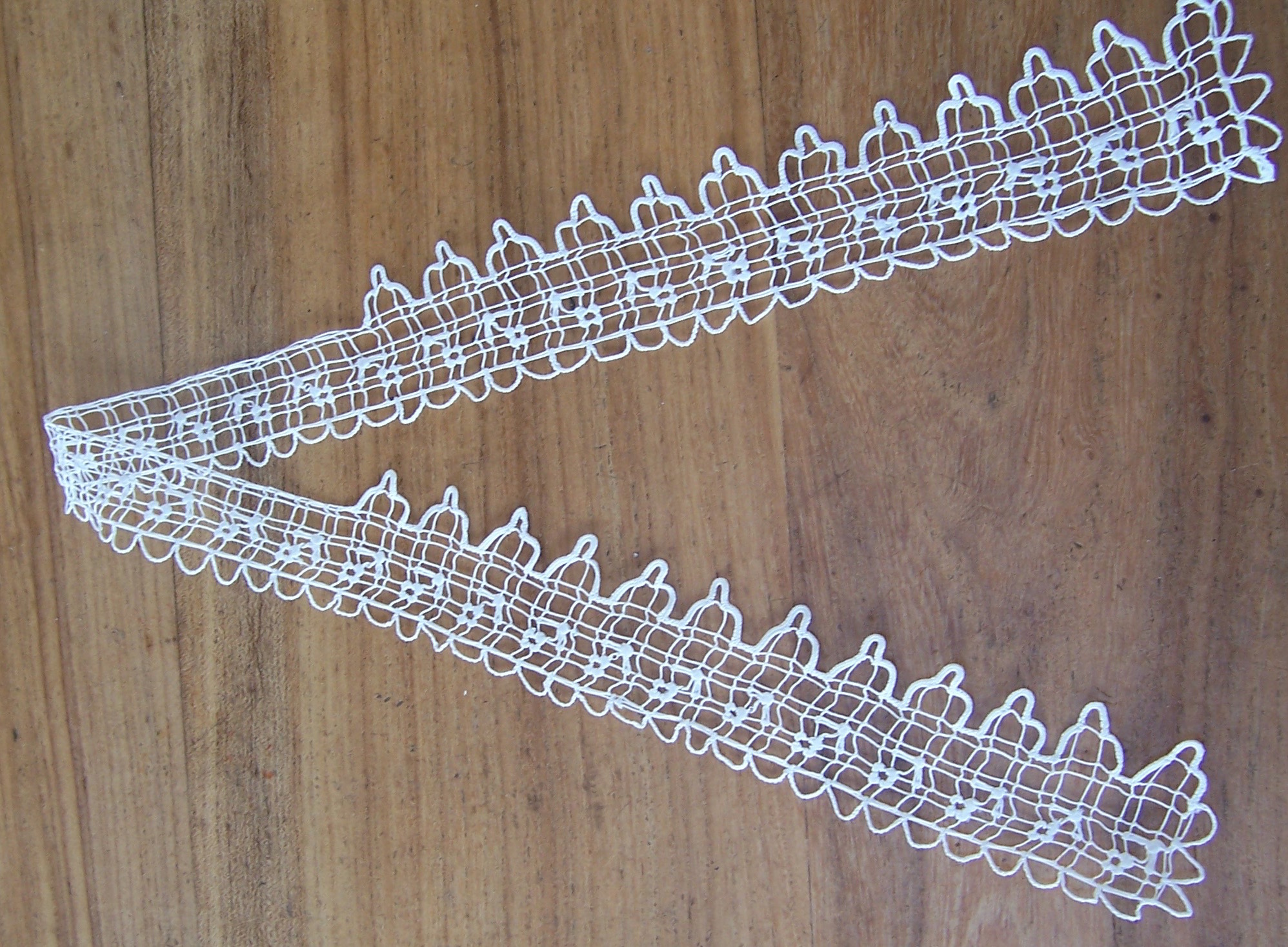 La pièce dite coiffe ou encore visagière. Reproduction récente d'Ijin ha Spered av Vro. Ce modèle de 68 cm de long sur 4,5 cm de large est réalisé en filet irrégulier et agrémenté de pointes festonnées. Bord en crochet sur le côté opposé. Photo Ijin.Immatriculation
